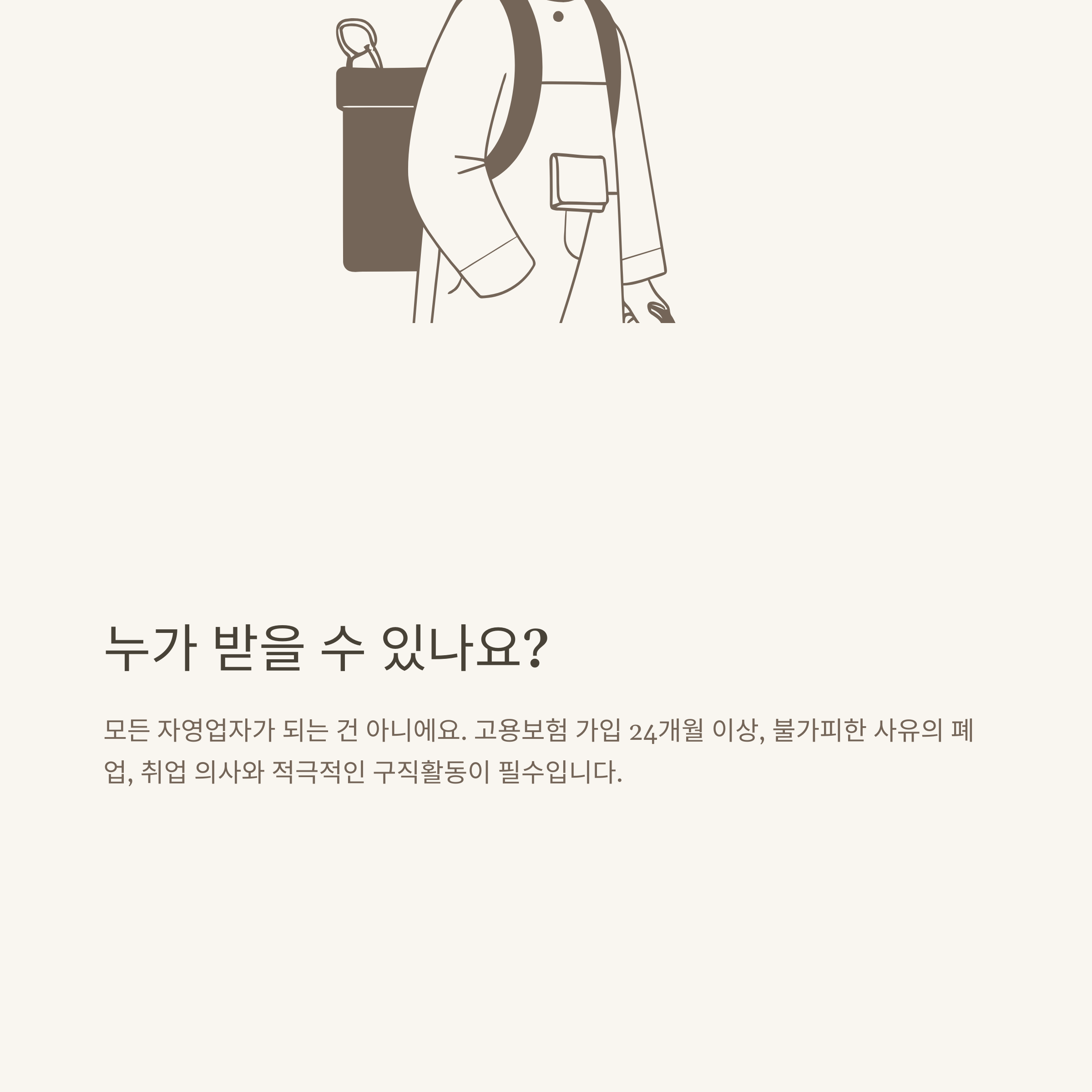 | 자격 | 고용보험 가입, 24개월 중 12개월 이상 보험료 납부 | 자영업자 |
