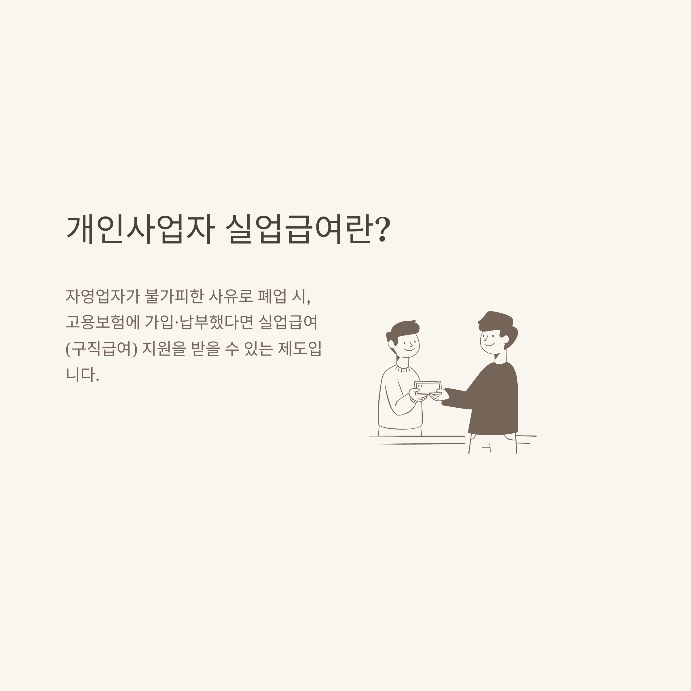 개인사업자 실업급여란, 자영업자가 폐업 등으로 더 이상 사업을 영위하지 못하게 되었을 때 일정 조건을 충족하면 고용보험을 통해 실업급여(구직급여)를 받을 수 있는 제도입니다. 예전엔 법적으로 '자영업자 고용보험'이 없었지만, 2020년부터는 고용보험법 개정에 따라 일정 조건을 갖추면 개인사업자도 실업급여를 신청할 수 있습니다.