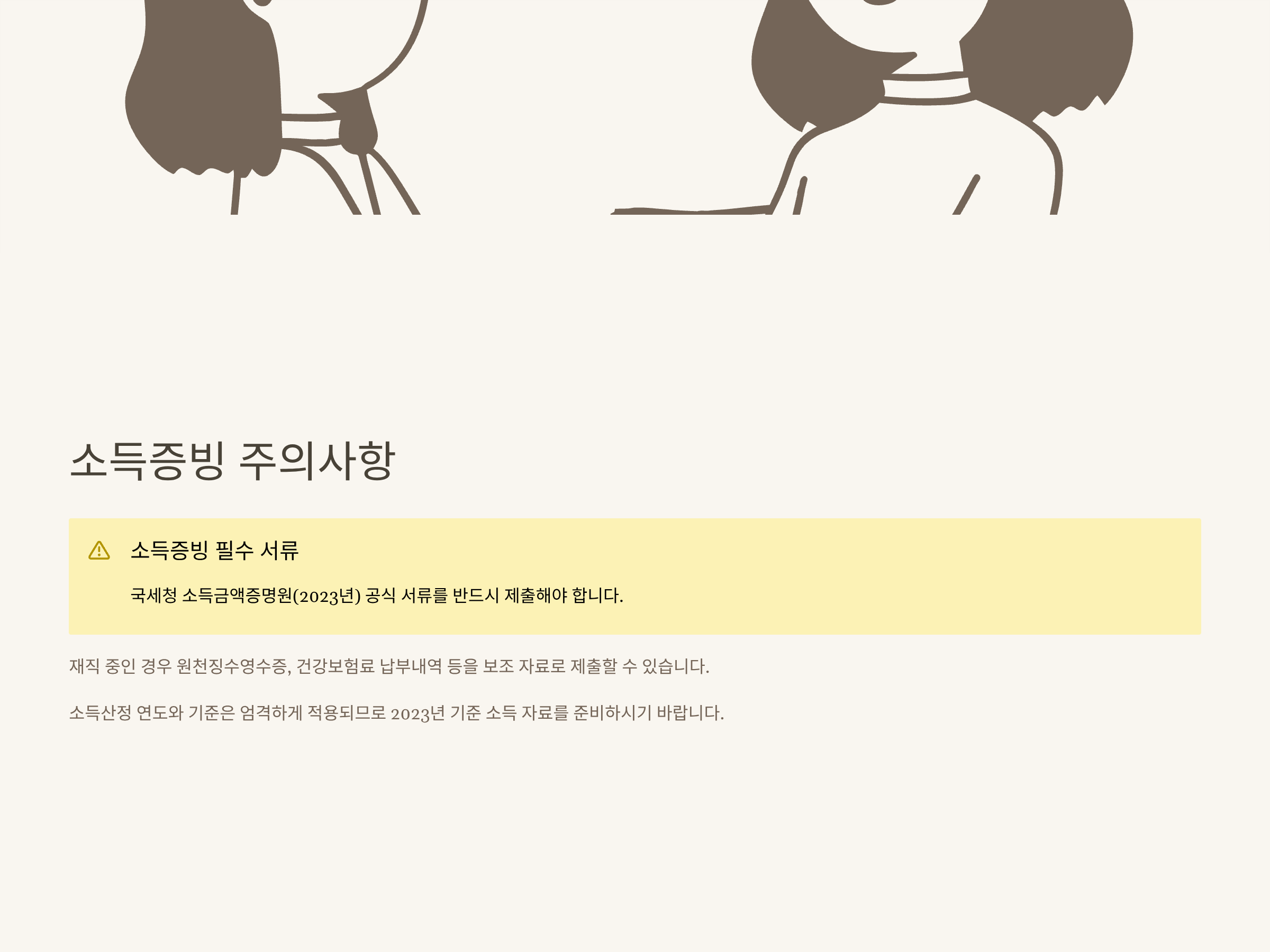 주의할 점은, 소득산정 연도(2023년)와 서류 기준을 꼭 맞춰야 한다는 점입니다. 혹시 헷갈리거나 모르는 내용이 있으면 시청·구청에 문의해 정확히 안내받으시길 꼭 추천드립니다. 국세청 홈택스 소득금액증명원 발급 바로가기