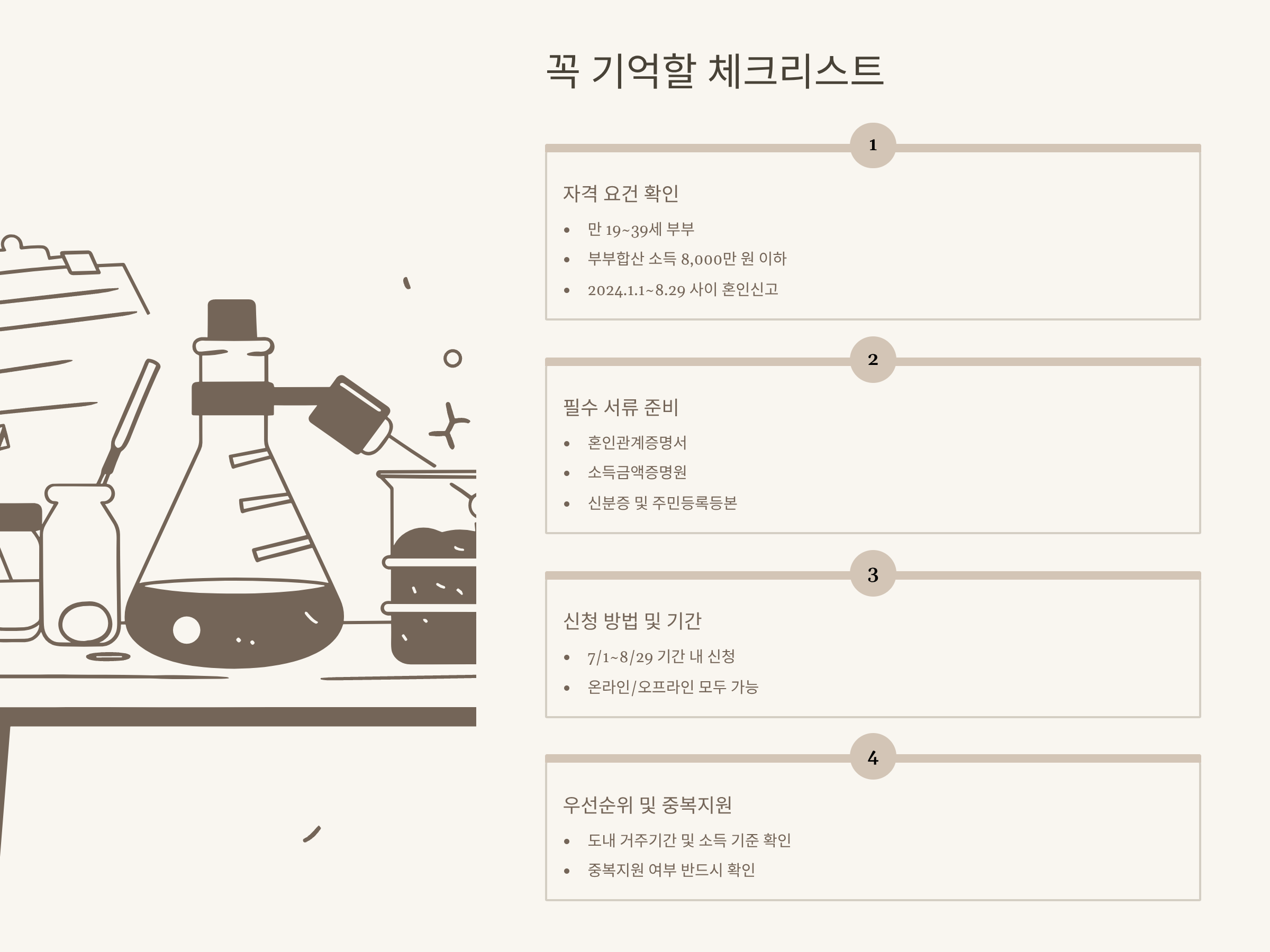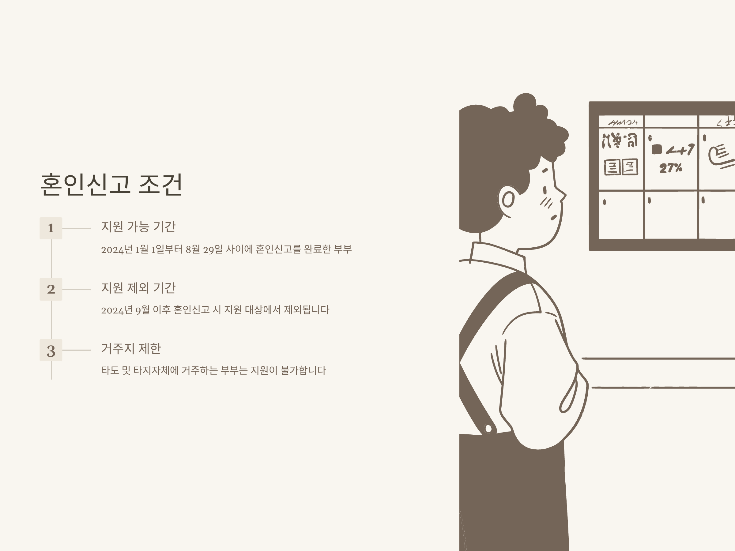 제가 가장 헷갈렸던 부분이 바로 혼인신고 기준이었습니다. 주변에서 “언제 신고해야 하냐”, “올해 말에 해도 받는 거냐” 질문을 정말 많이 들었는데요. 경기도 공식 안내에 따르면, 2024년 1월 1일부터 8월 29일 사이에 혼인신고를 한 신혼부부만 지원대상이 됩니다. 즉, 2024년 9월 이후 혼인신고 하신 분들은 이번 100만원 지원 사업에서는 아쉽게도 제외됩니다. 또한 올해 처음 시범사업으로 시행되는 만큼, “2024년 안에 결혼하면 무조건 준다”는 이야기는 사실이 아니었어요. 저도 이 부분에서 혼동이 있었는데, 시·군청 담당자 분이 “신청서 접수 및 검증, 지급 절차를 고려해서 불가피하게 8월 29일까지로 마감했다”고 직접 설명해주셨습니다. 여기에 더해, 기존에 비슷한 지원금을 받은 적이 있거나, 타 시·도에 거주 중인 경우 등도 일부 제한될 수 있습니다. 특히 5년 내 도내 거주기간이 짧으면 우선순위가 밀릴 수 있으니 참고해야 합니다.
