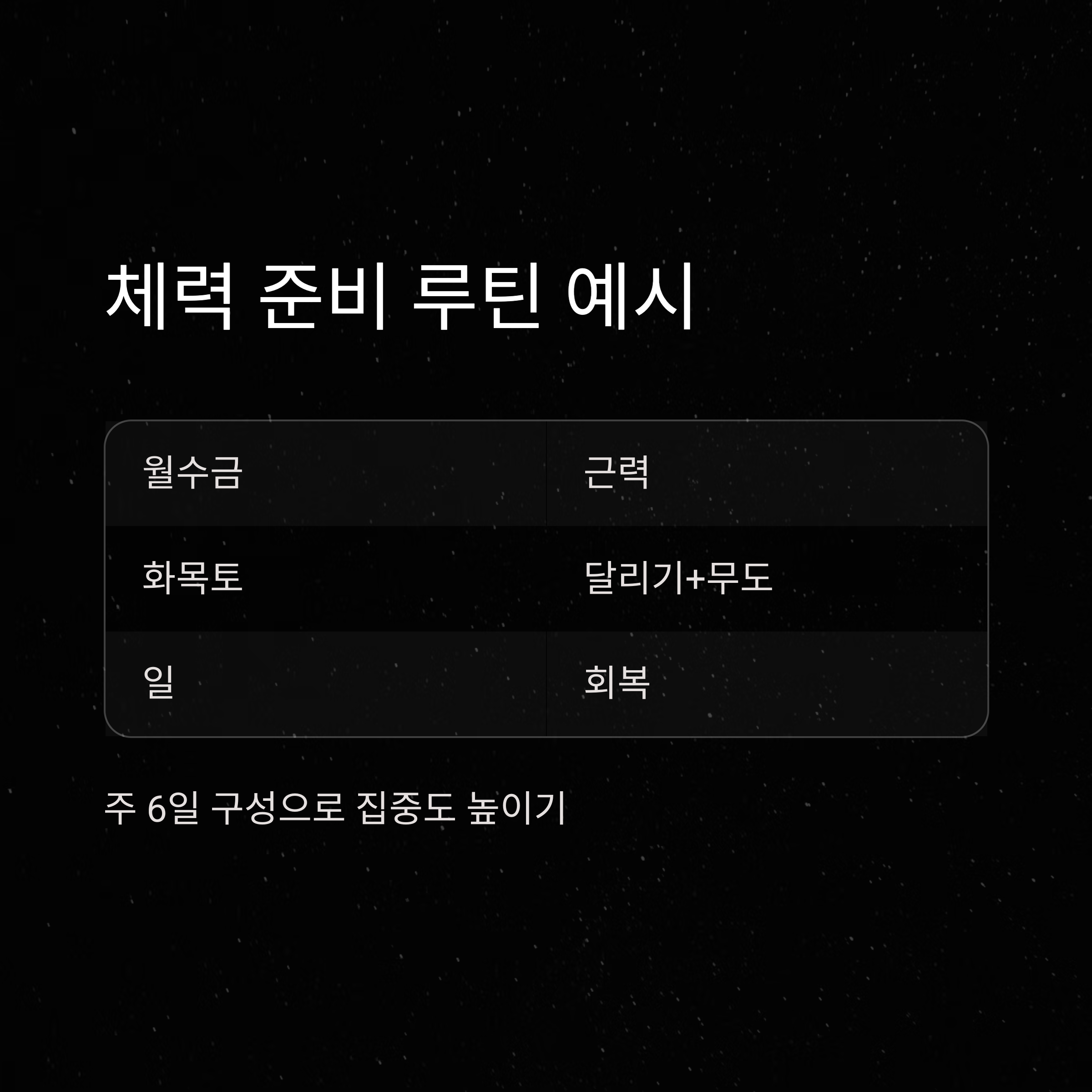 제가 실제로 6주간 사용한 루틴은 체력·무도·멘탈 균형이 핵심이었습니다. 초반에는 체력 중심으로만 훈련하다 무도와 심리에서 실수했고, 이를 보완하려 한 주간 리커버리(w/ 휴식+스트레칭)를 포함했습니다.