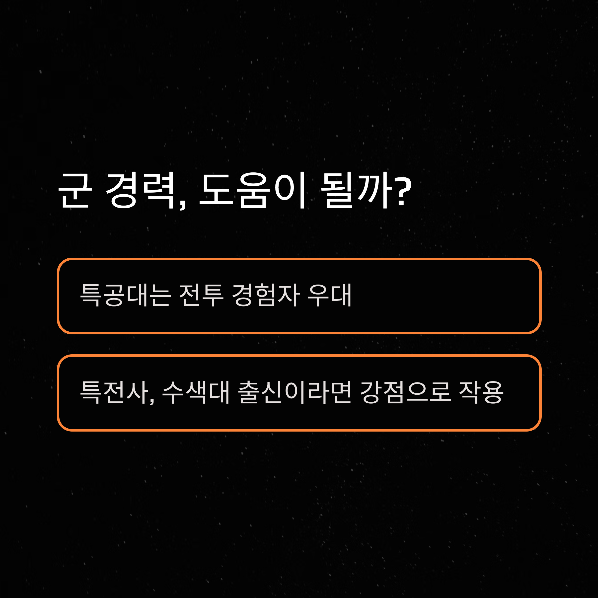 군 복무 경력이 있는 사람은 필드 경험과 팀워크, 리더십 측면에서 유리합니다. 저도 군대 시절 야간 훈련과 고강도 작전 경험이 도움이 되었습니다. 경찰특공대 모집요강에는 ‘전투 or 특전사 경력 우대’라는 문구가 있었고, 실제로 면접에서도 “군사작전 경험 있나요?”라는 질문이 나왔습니다.