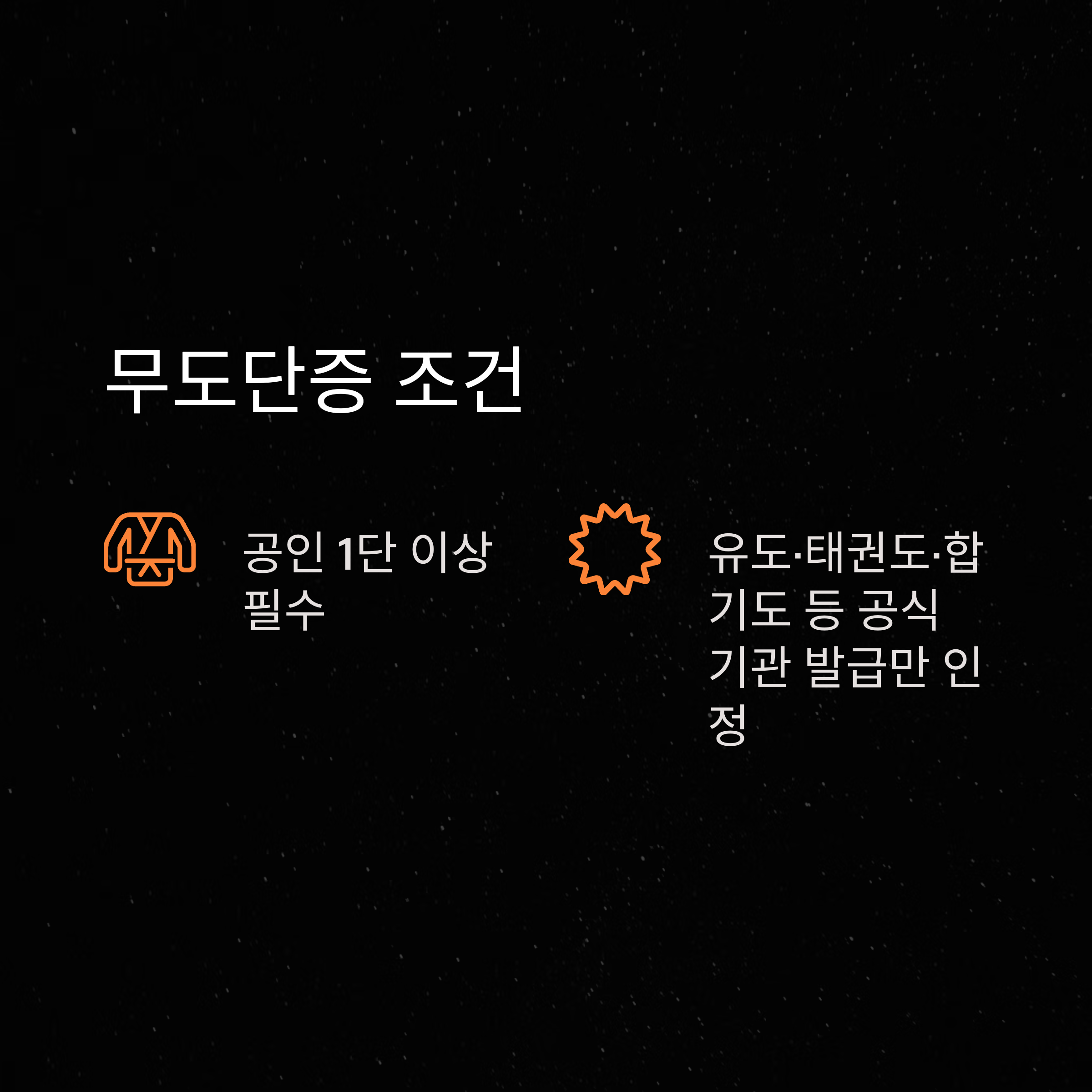 | 무도 자격 | 공인단증 1단 이상 | 유도, 태권도 등 |