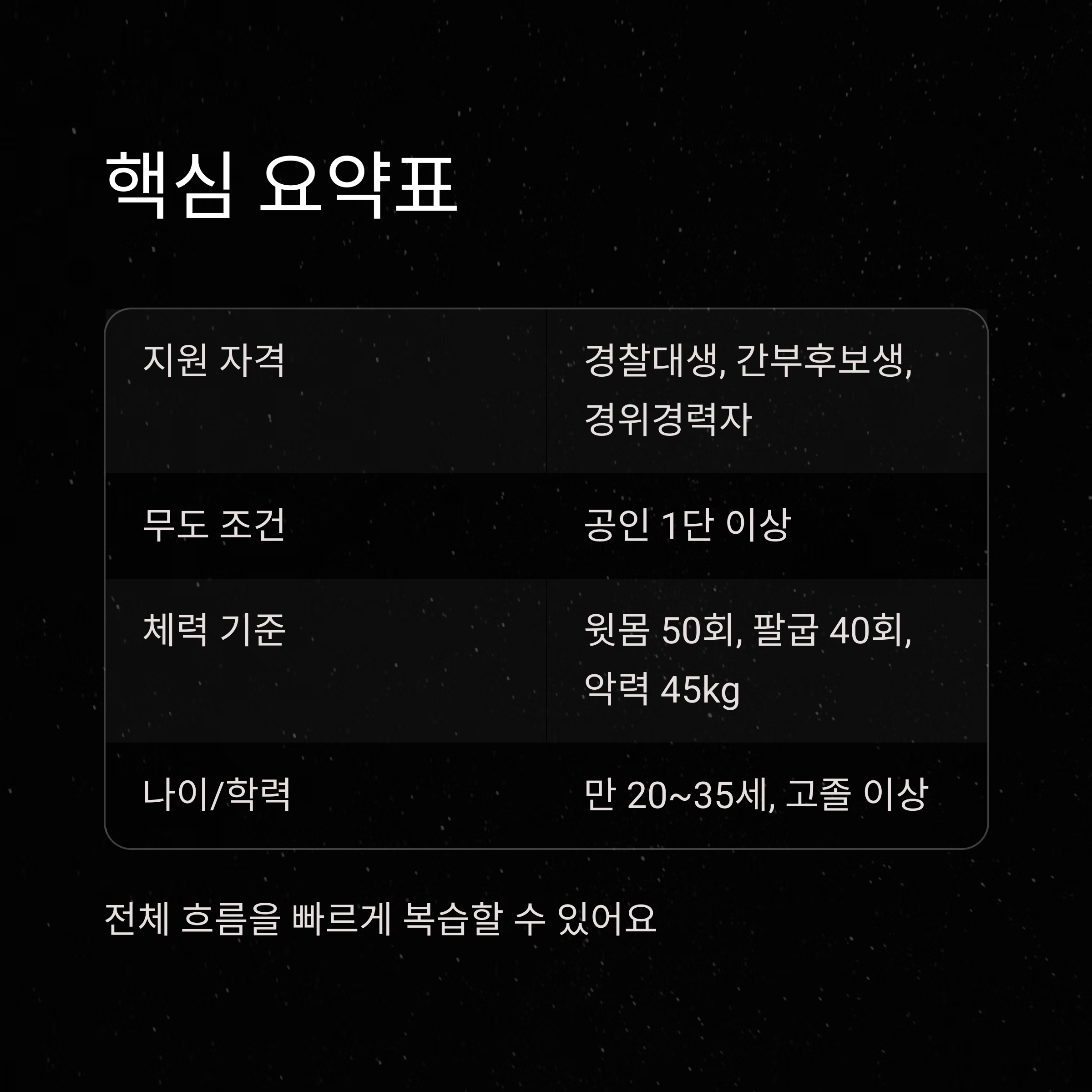 아래는 경찰특공대 지원자격에 대한 주요 요건과 준비 요소를 요약한 표입니다. 이 표 하나로 전체 흐름을 빠르게 복습할 수 있어요.