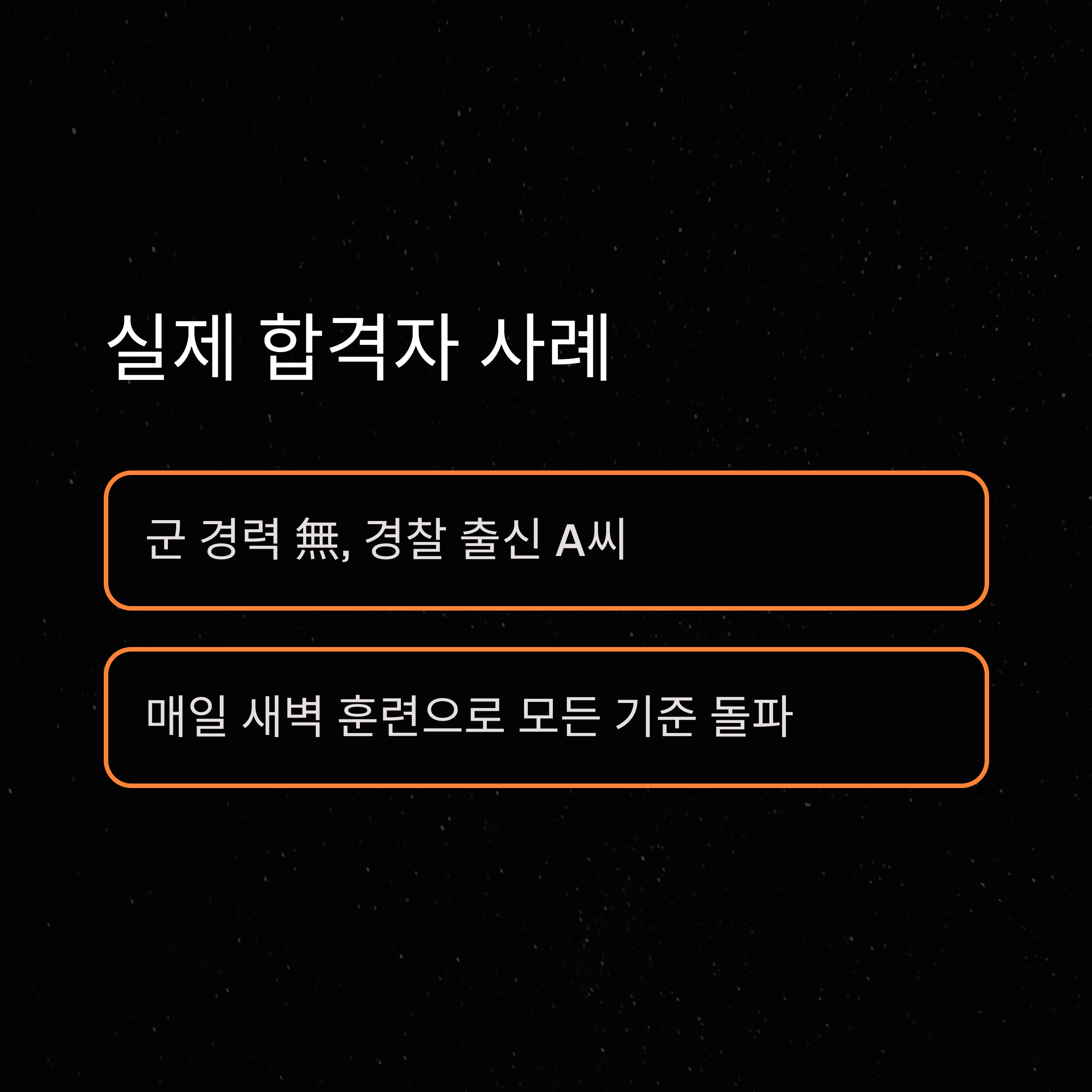 저와 함께 준비했던 지인 중 경찰특공대 최종합격을 한 A씨는 군 경력 없이 일반 경찰로만 근무했던 분이었습니다. 체력과 무도에서 불안감을 느끼며 시작했지만, 6개월간 매일 새벽 5시에 일어나 루틴을 실천하며 결국 모든 종목 평균 이상을 기록했어요.