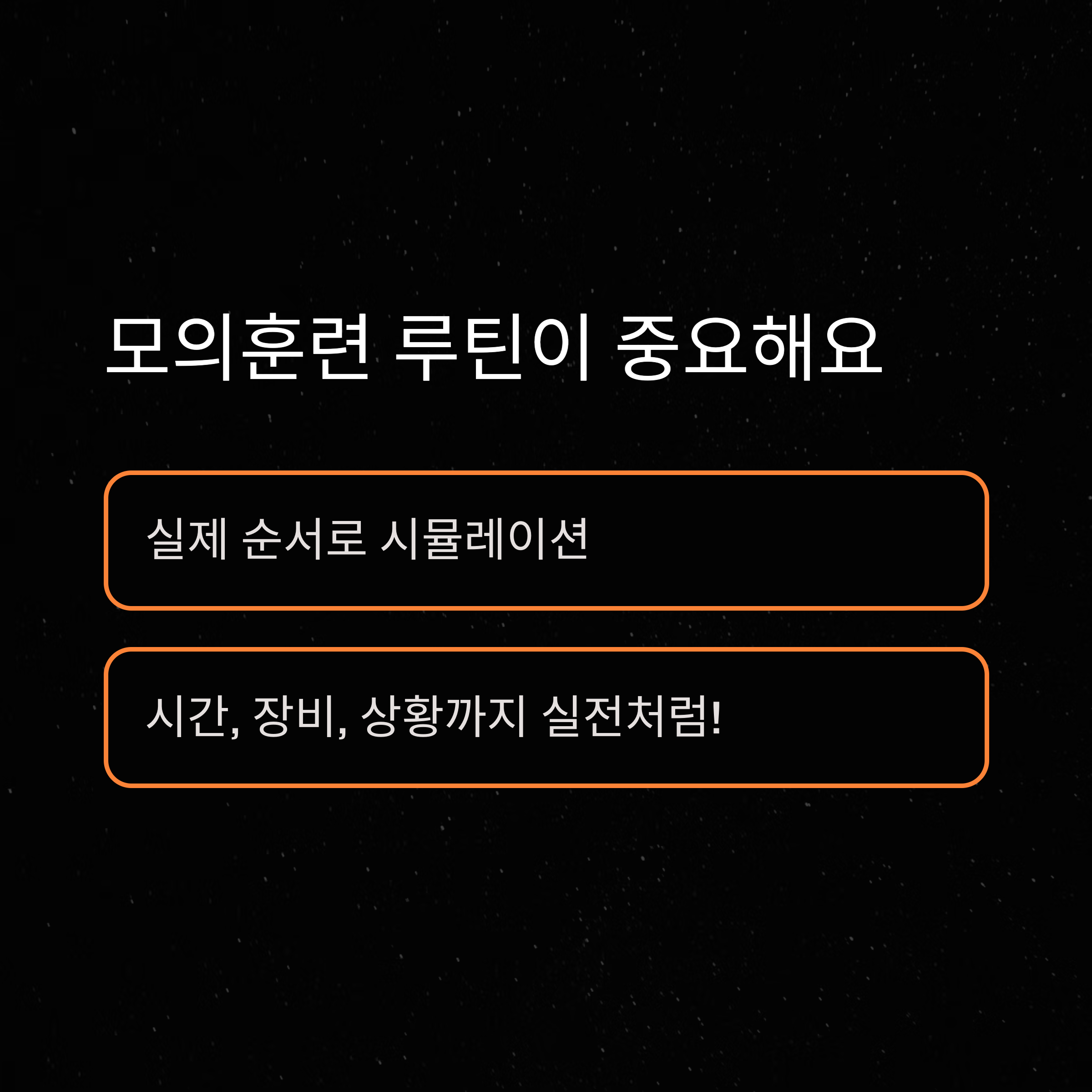 시험 4주 전, 저는 실제 응시 흐름(체력 → 무도 → 심리)을 재현한 모의훈련 루틴을 주 2회 실행했습니다. 처음에는 긴장 때문에 윗몸일으키기를 정확히 못 했고, 무도 시범에서 손동작이 흐트러졌습니다. 그래서 각각 구간별로 체크리스트(타이머, 순서, 동작 포인트)를 만들어서 푸시업 30회 후 1분 휴식, 무도 입장 대기 30초처럼 정말 실전과 동일하게 연습했습니다. 이 덕분에 실제 시험 당일에는 "이제 이럴 거야"라는 마음으로 차분히 임할 수 있었고, 당황할 상황이 거의 없었어요.