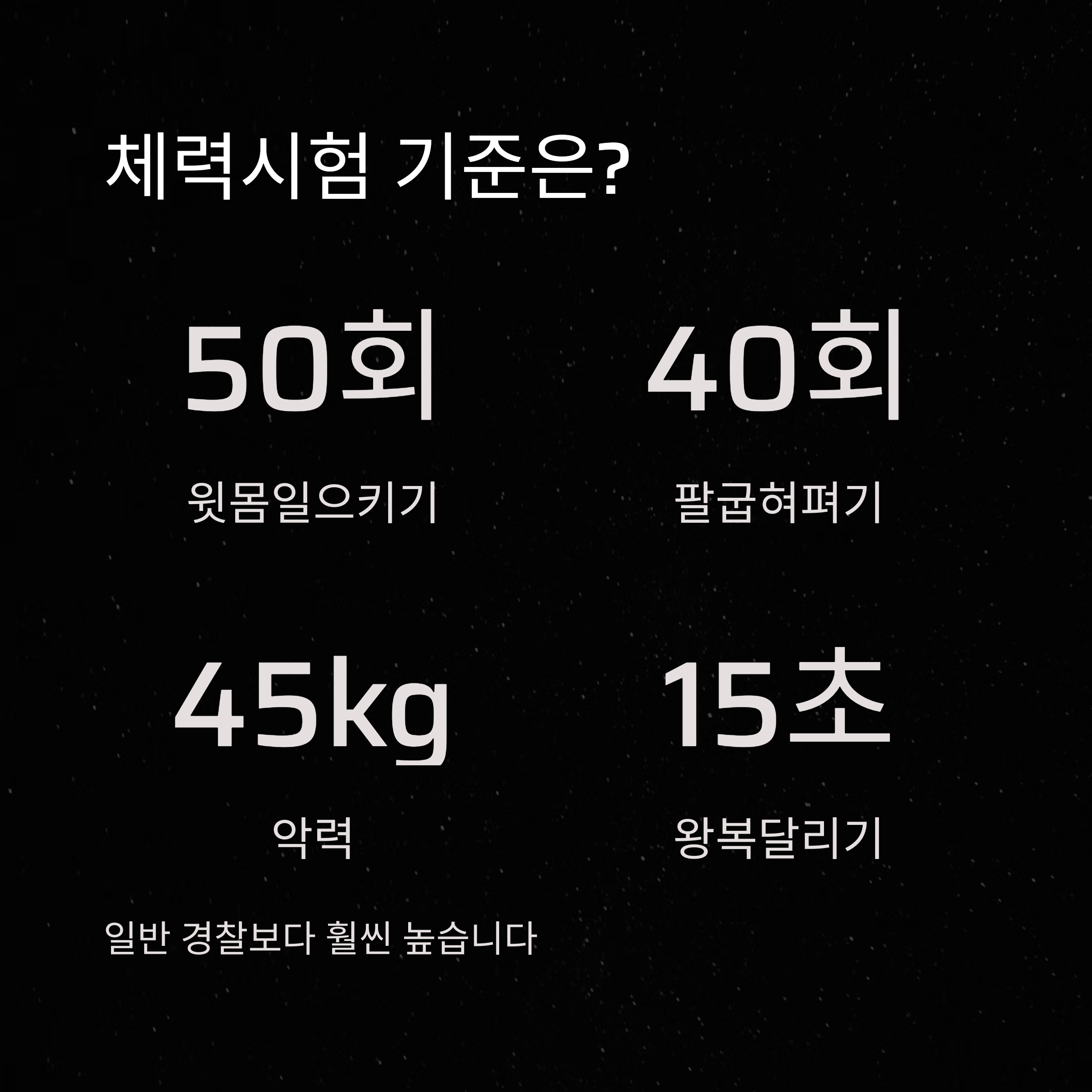 | 체력 기준 | 윗몸, 팔굽, 악력, 달리기 등 | 모두 평균 이상 필요 |