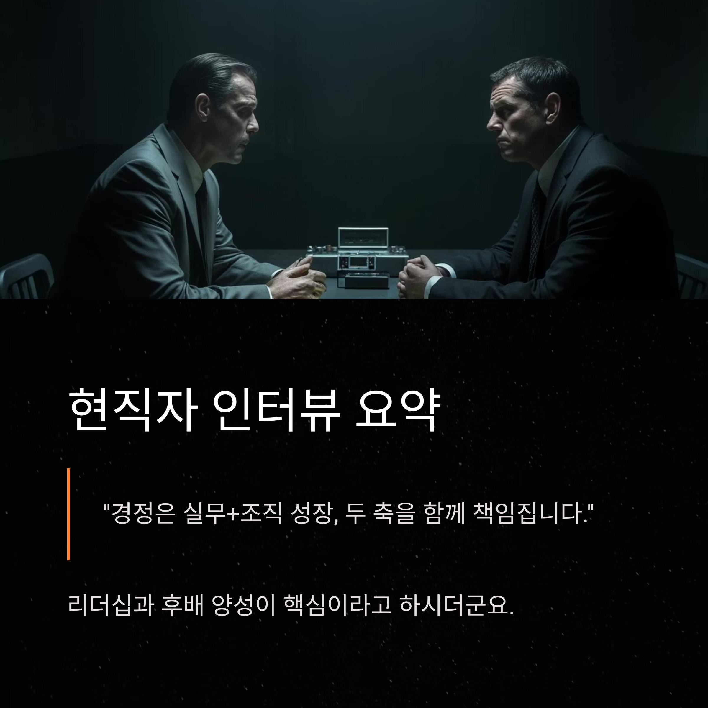이 인터뷰에서 인상 깊었던 건, 승진보다 ‘팀 관리’와 ‘후배 양성’을 강조하셨다는 점이었어요. 정말 리더란 이런 분을 두고 하는 말이구나 싶었습니다.