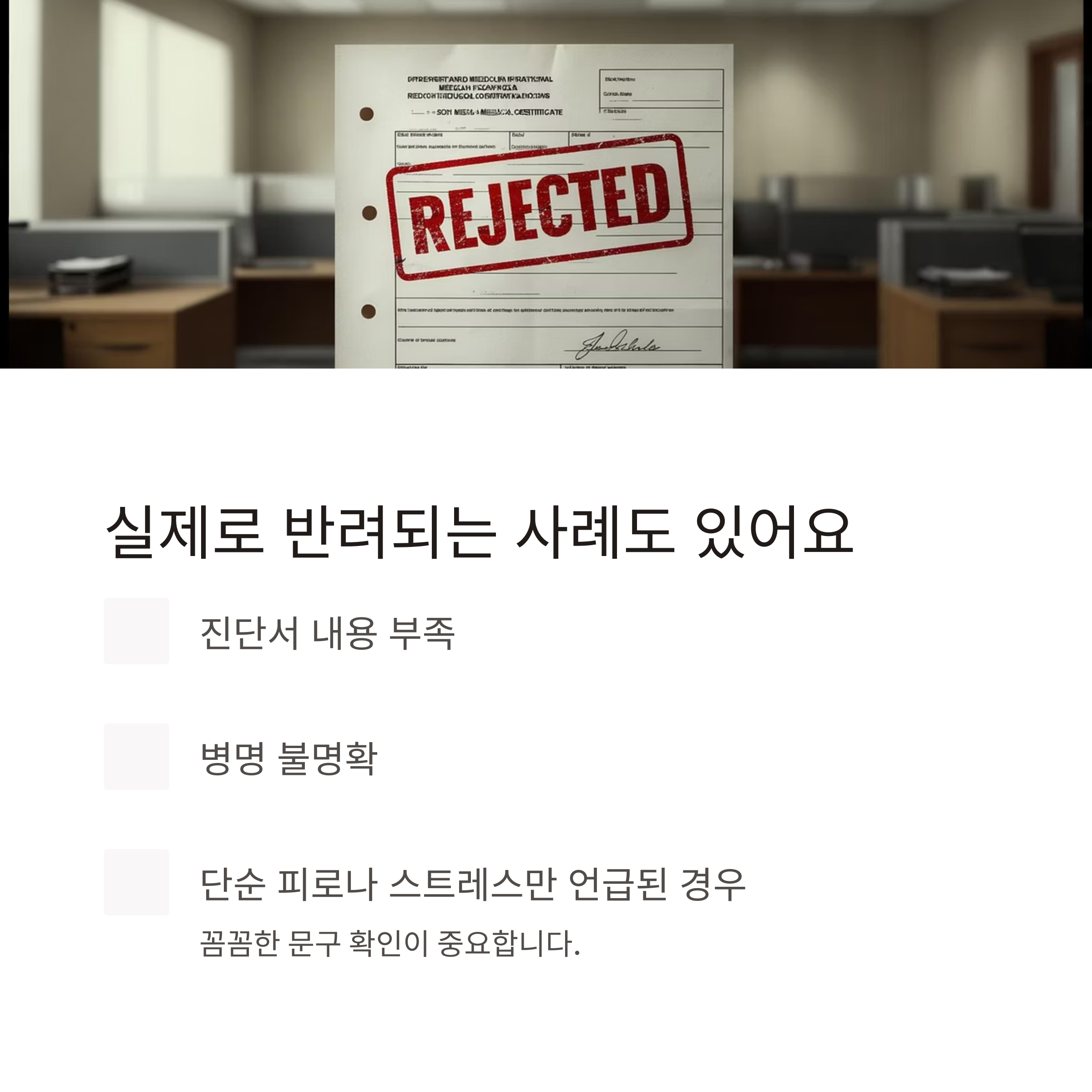 한 사례로, 제 동료는 ‘피로감’이라는 모호한 표현이 진단서에 들어가 있었다가 반려됐고, 이후 ‘번아웃 증후군으로 인한 2개월 요양 필요’라고 수정한 진단서를 제출해 승인받았습니다.