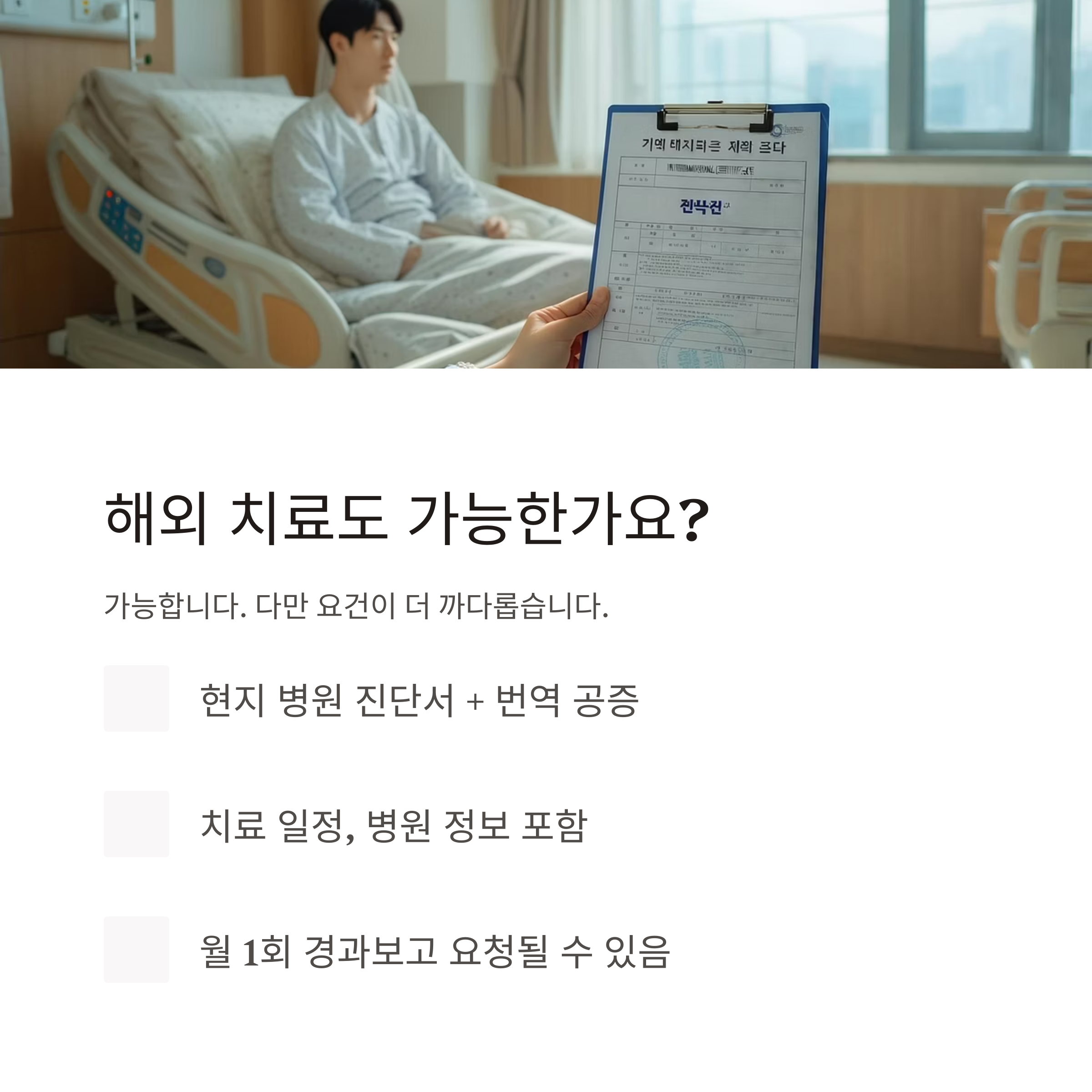 - 해외 병원 진단서 (병명, 치료기간, 치료계획 포함)