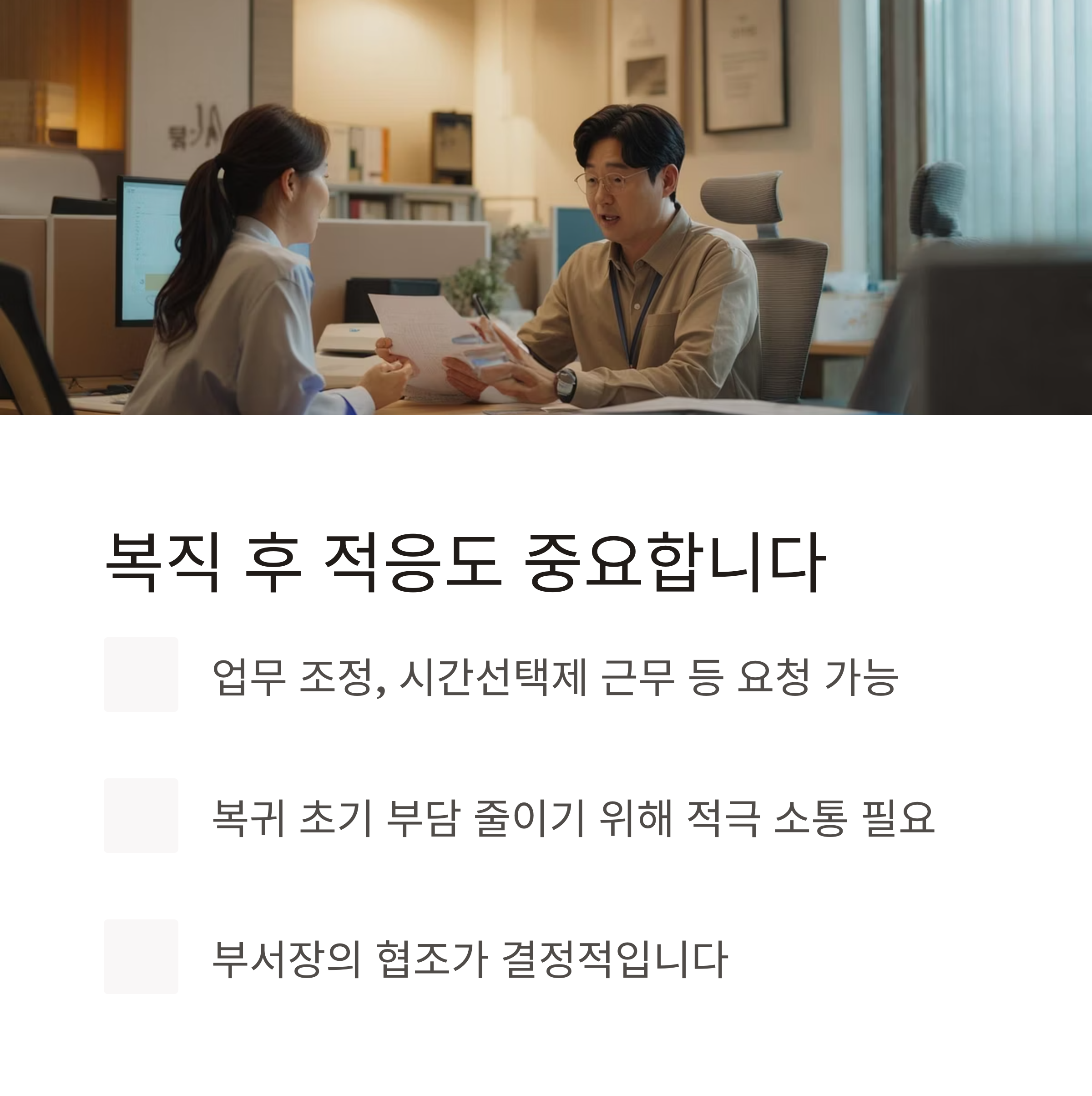 복직 후에는 1~2개월 동안 단계별 업무 적응 기간을 두는 것이 좋습니다. 저는 2주간 시간선택제 근무를 요청해 무리 없이 복귀할 수 있었어요.