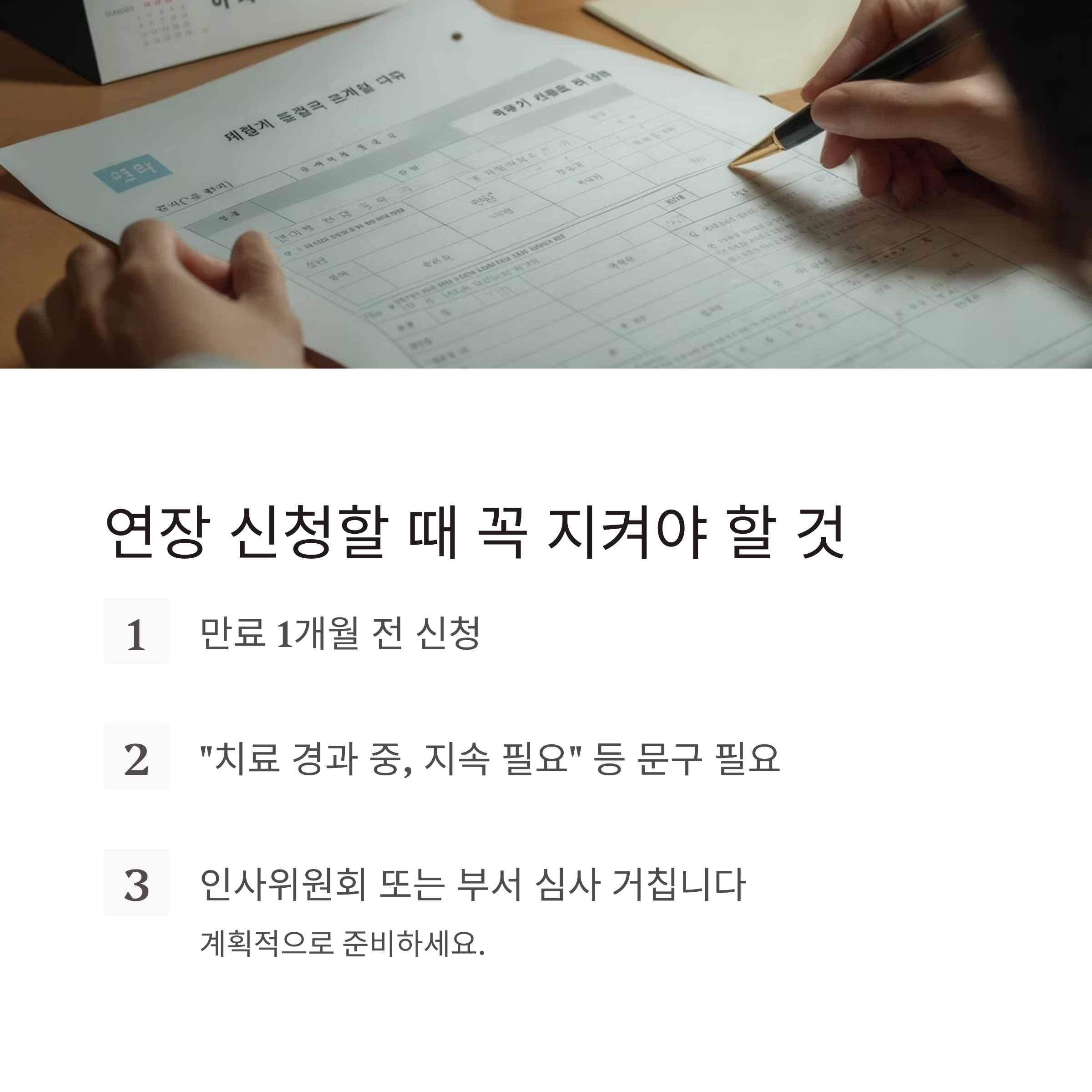 주의할 점은 한 번에 2년을 신청하는 것이 불가능하다는 겁니다. 반드시 1년 단위로 나눠 신청해야 하며, 두 번째 연장은 최초 진단서보다 더 구체적인 치료 경과가 포함되어야 합니다.