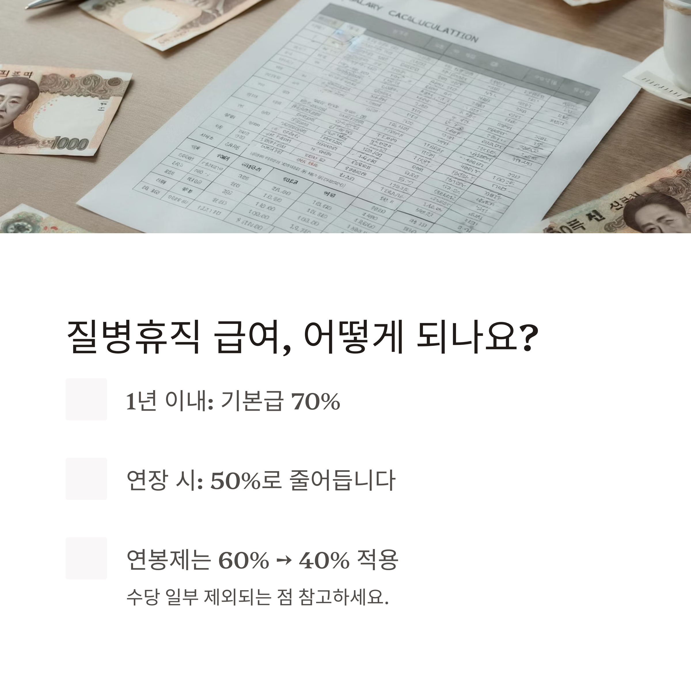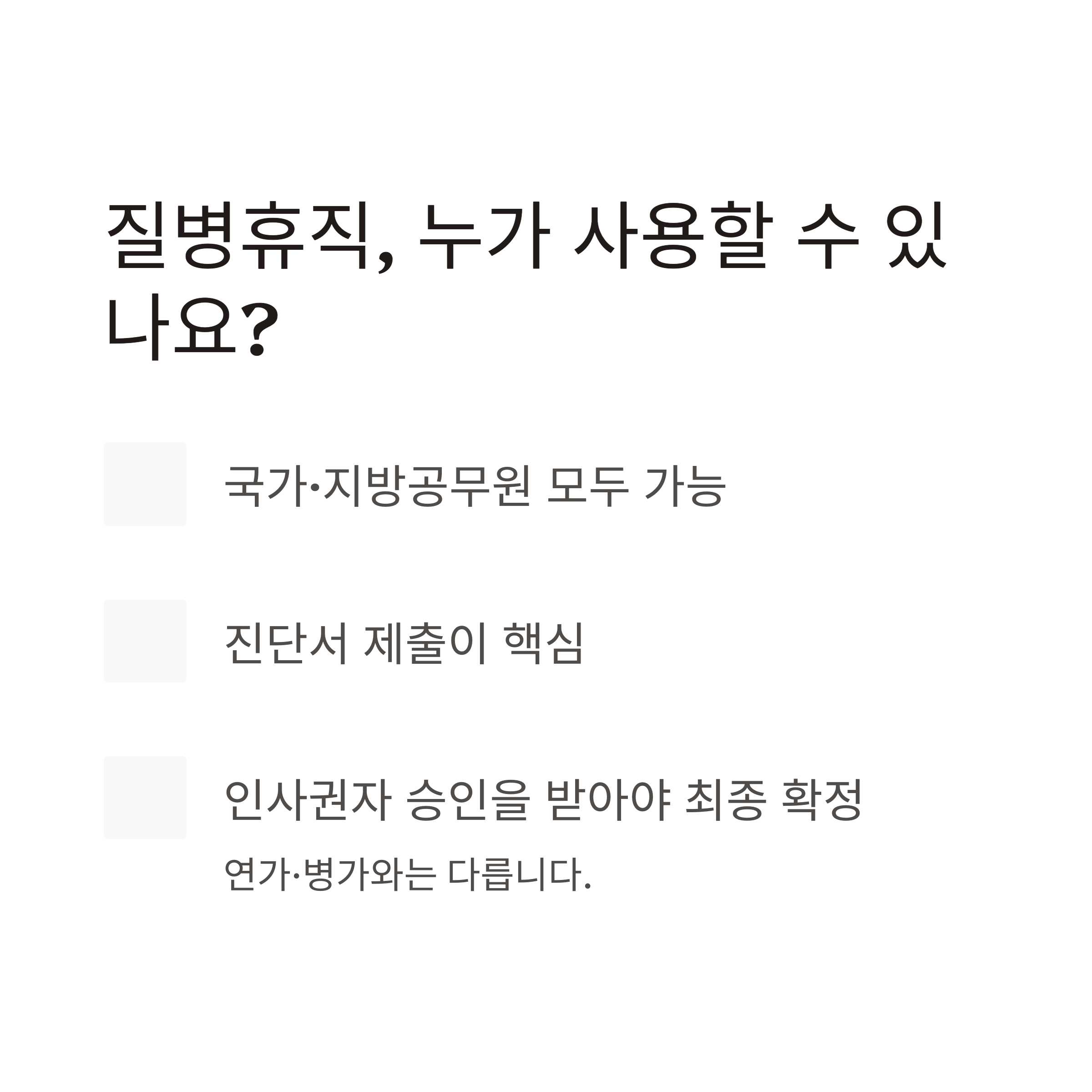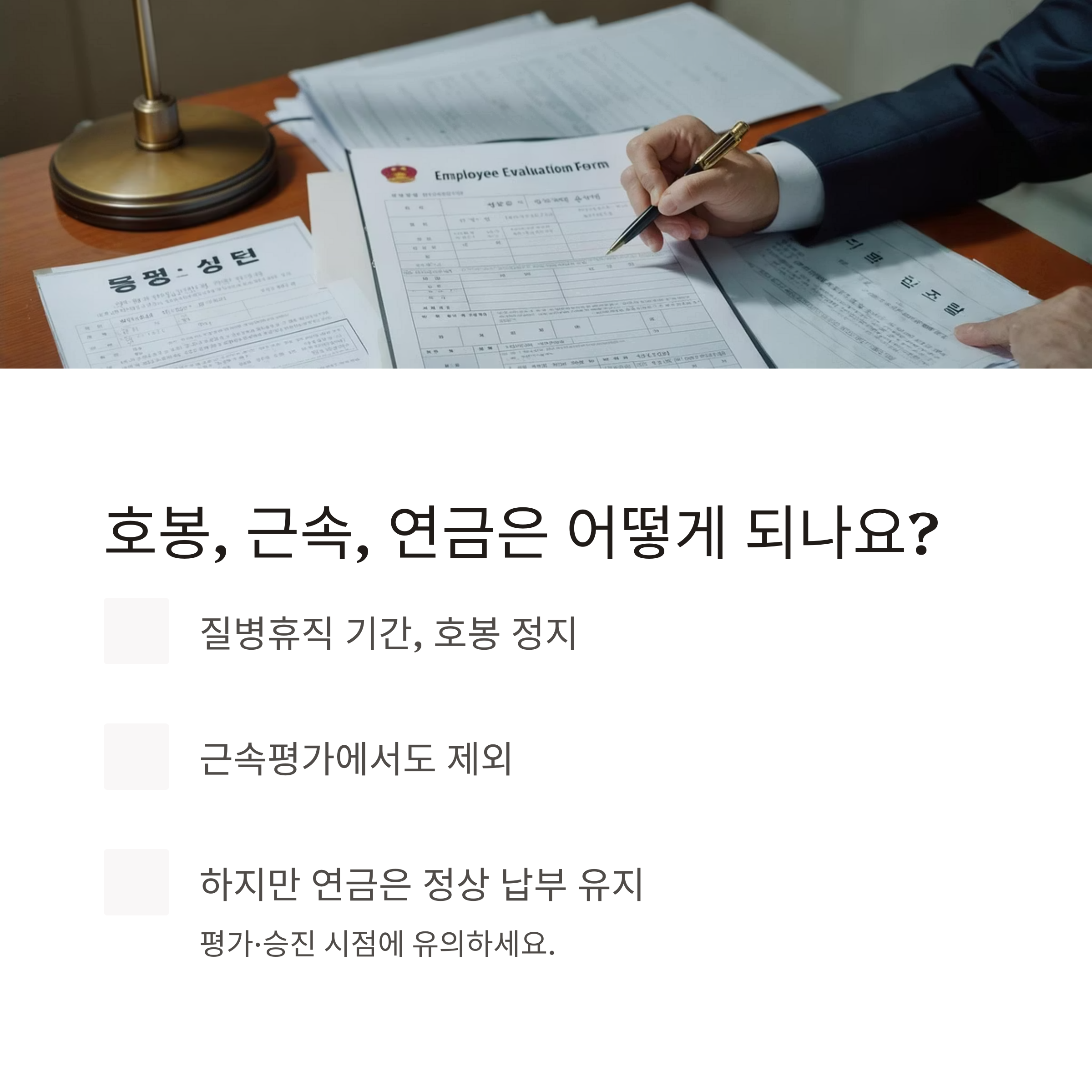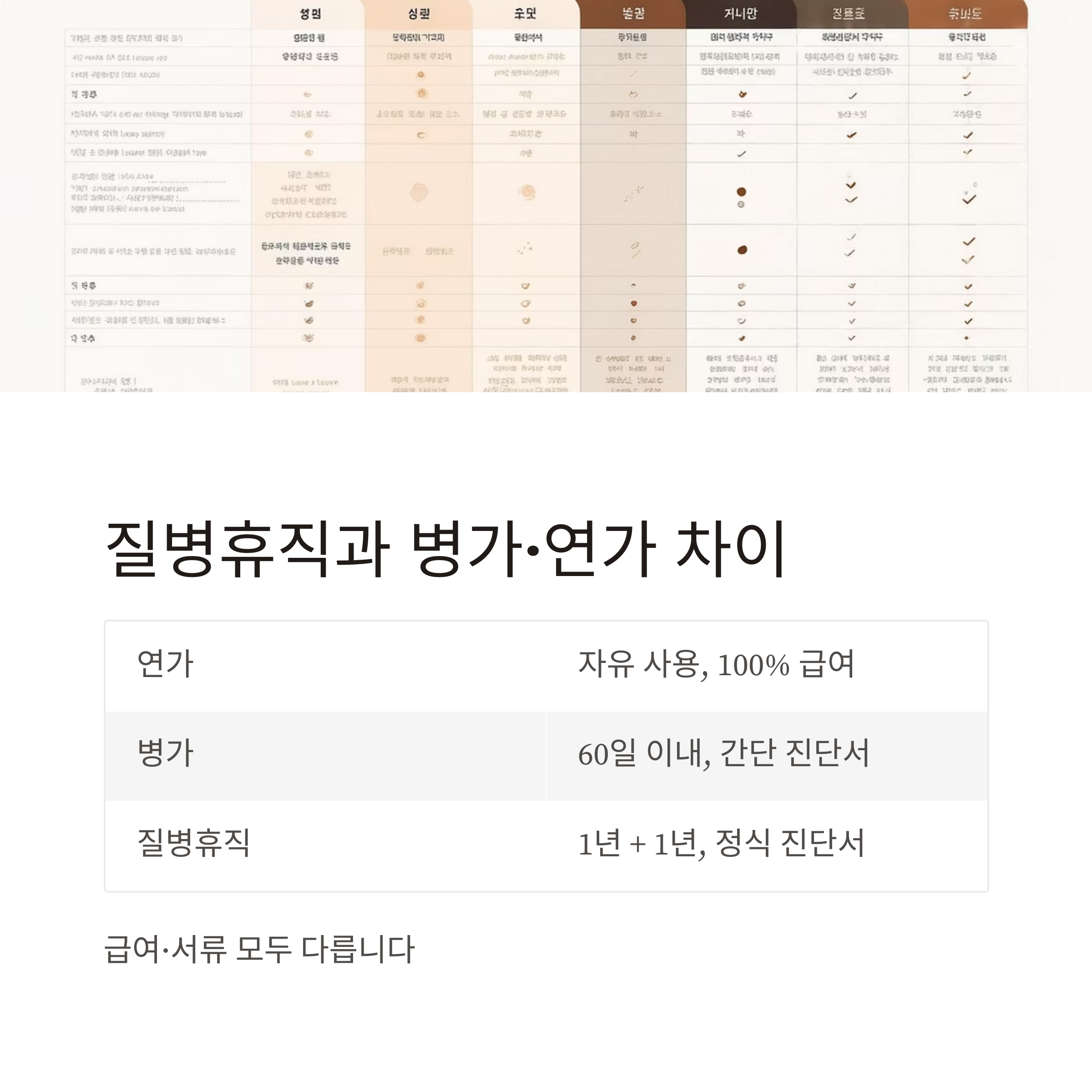 이 제도를 몰랐다면 저는 장기 병가 처리로 실적 손실이 컸을 겁니다. 질병휴직은 신분 유지와 건강 회복을 동시에 보장하는 유일한 제도라는 점에서 꼭 알아두셔야 합니다.