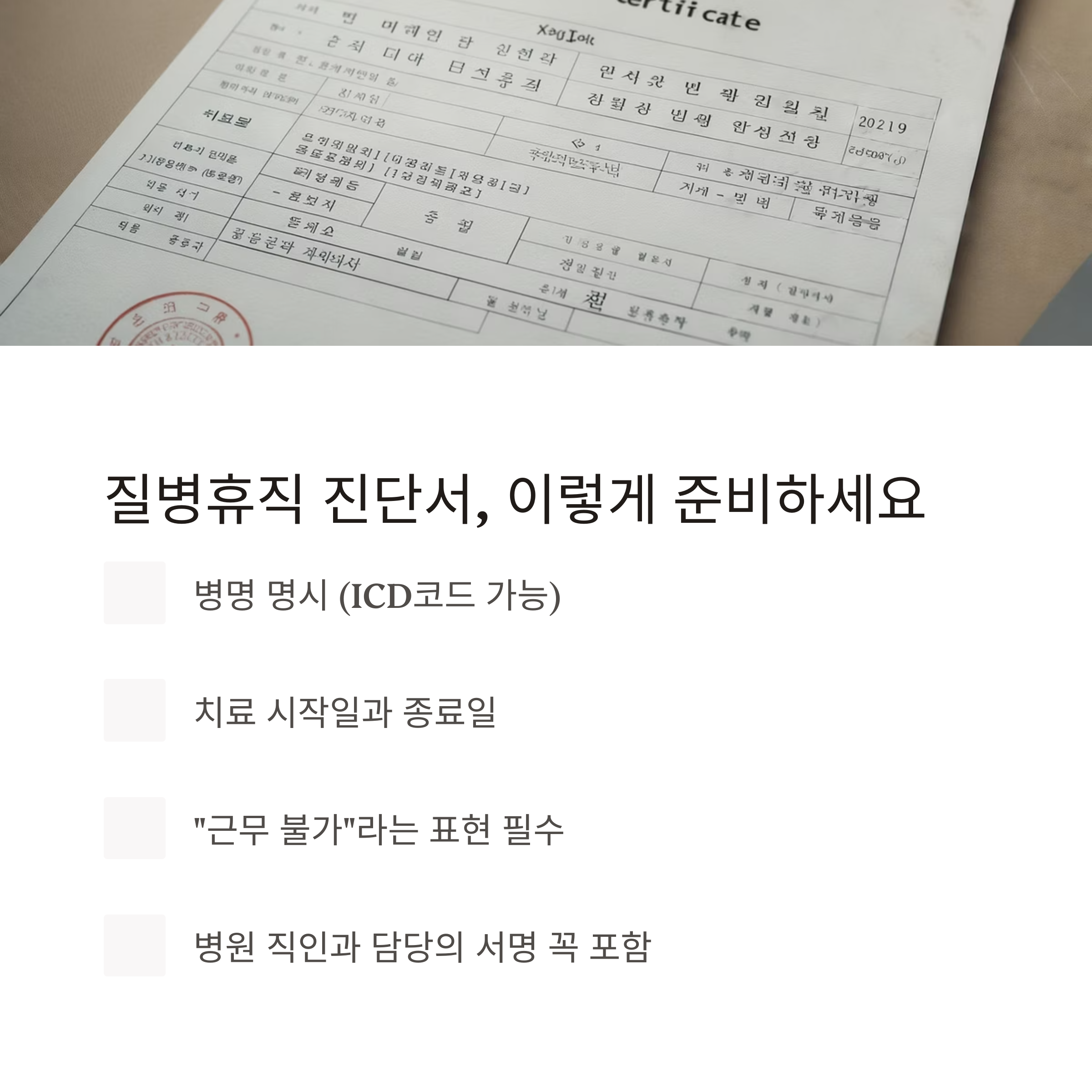 | 인정 진단서 | 종합병원 이상, 명확한 병명 필수 |