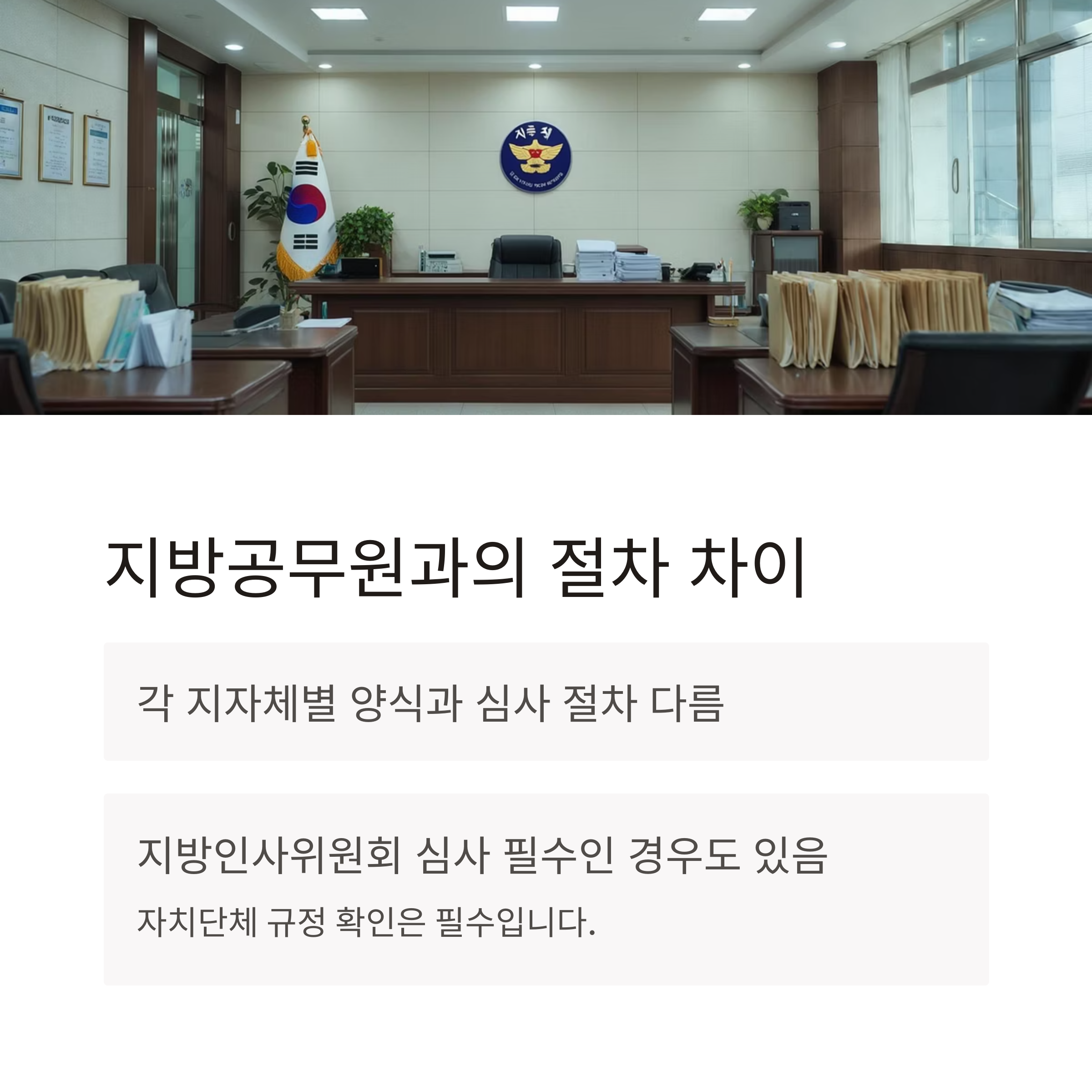 | 관할 기관 | 인사혁신처 지침 따름 | 각 시·도청 인사과, 지방인사위 |