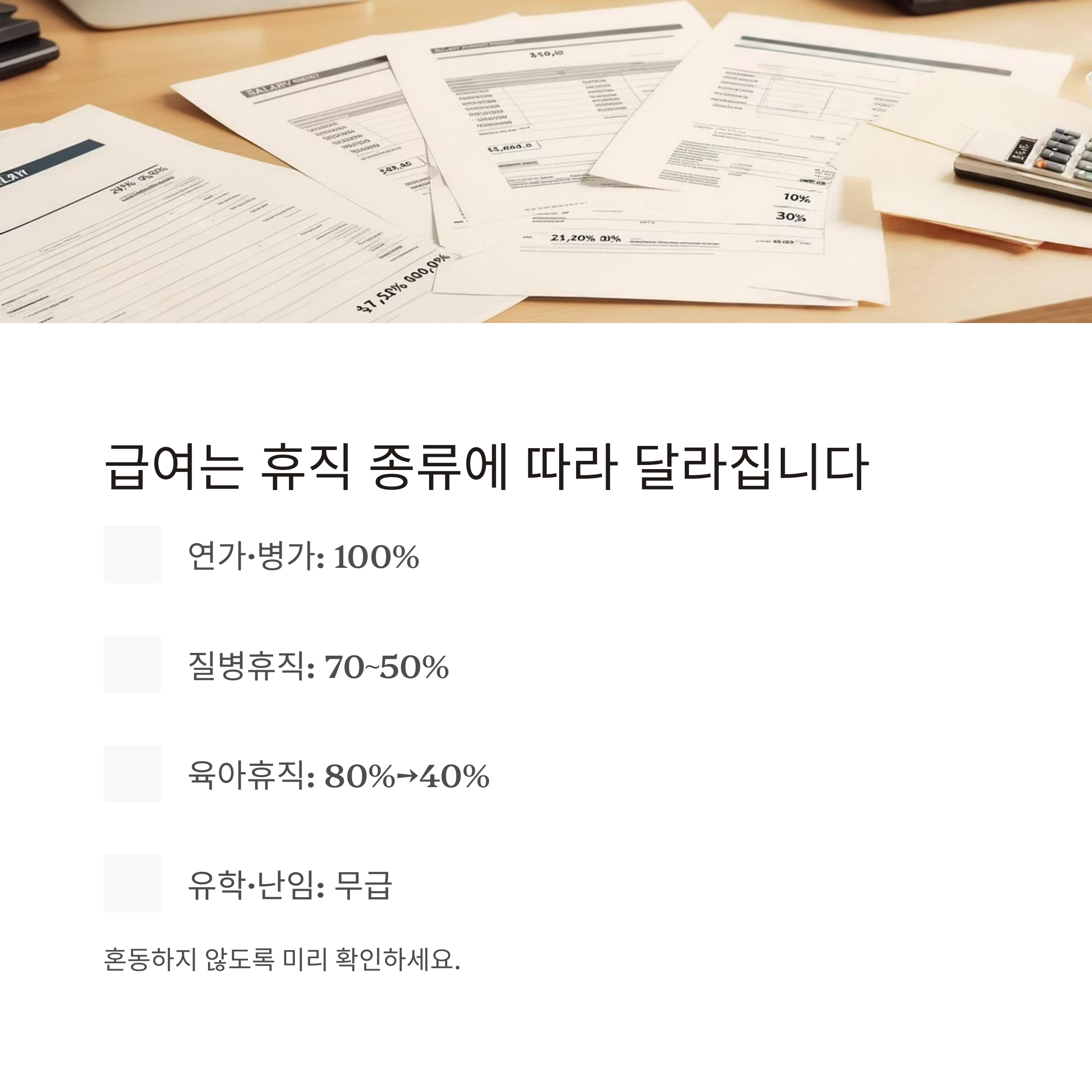 많은 분들이 휴직하면 급여를 아예 못 받는다고 오해하시는데요, 공무원 휴직은 종류에 따라 급여가 지급되거나 무급으로 나뉩니다. 저도 처음 육아휴직 신청할 때 급여가 줄어들어 생활비를 따로 계획해야 했던 기억이 있습니다.