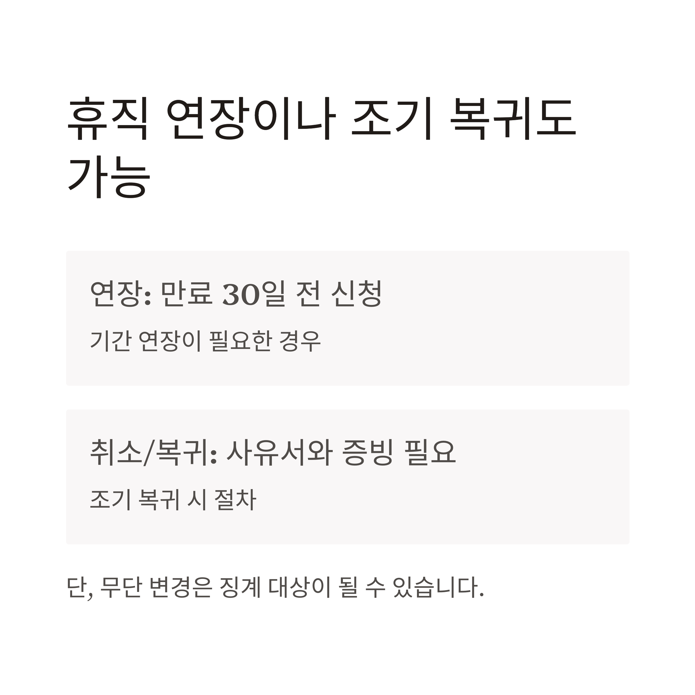 주의하실 점은 사적 사유로 인한 무단 복귀 지연은 인사상 징계 사유가 될 수 있다는 점입니다. 연장은 가능하지만, 정당한 이유와 계획이 있어야 승인이 원활합니다.