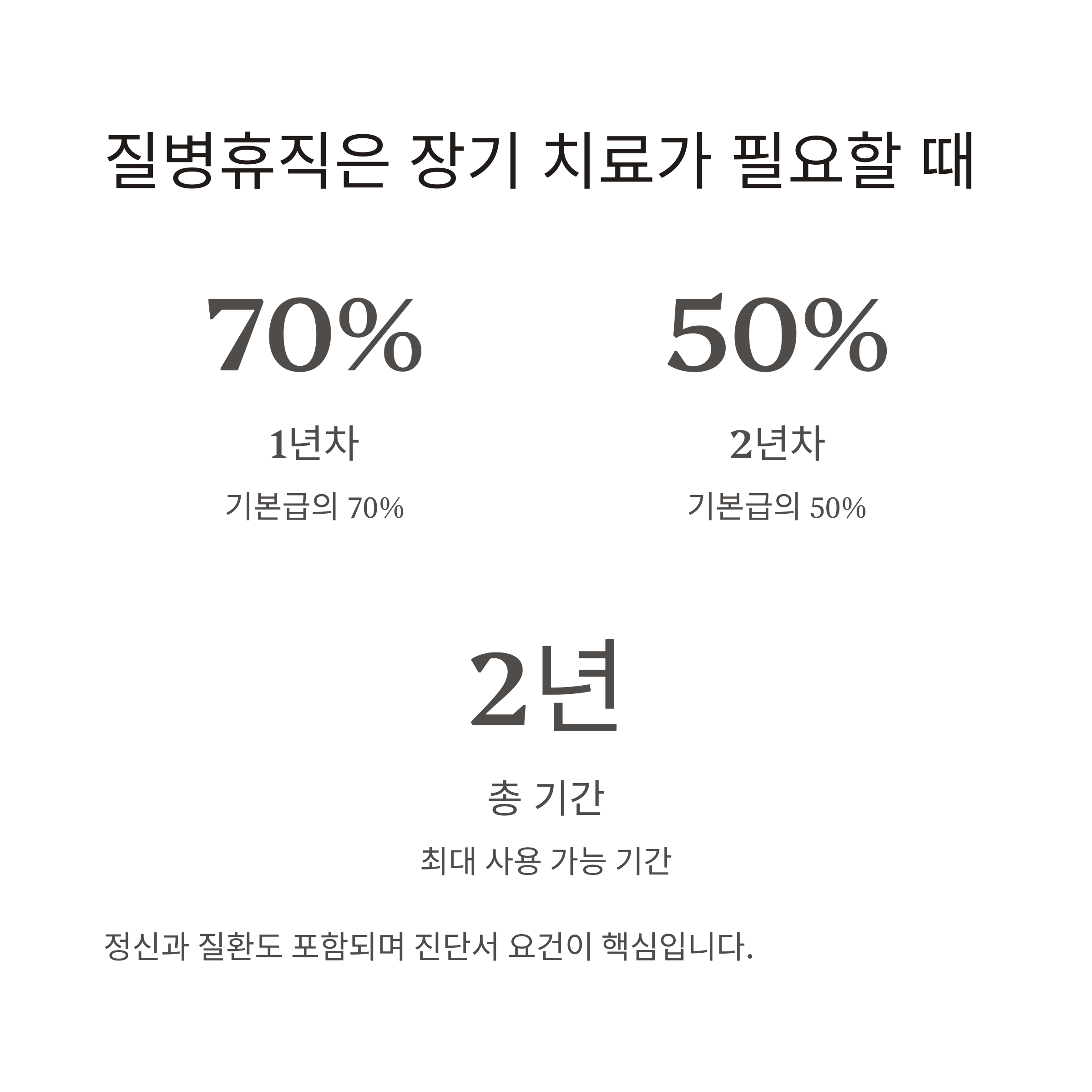 | 질병휴직 | 장기 치료가 필요한 경우 | 1년 70%, 이후 50% | 2년 |