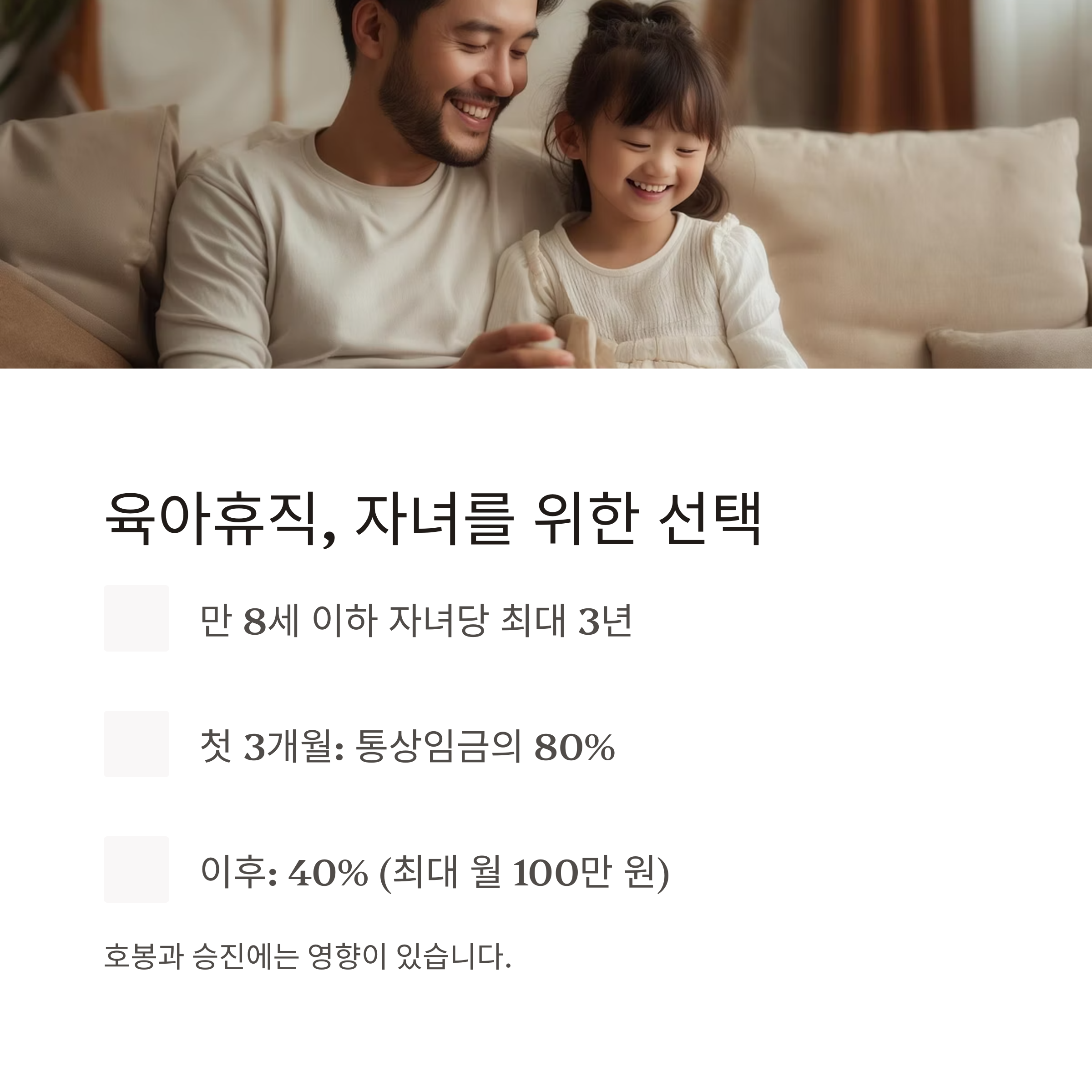| 육아휴직 | 만 8세 이하 자녀 양육 | 첫 3개월 80%, 이후 40% | 3년 (1자녀당) |