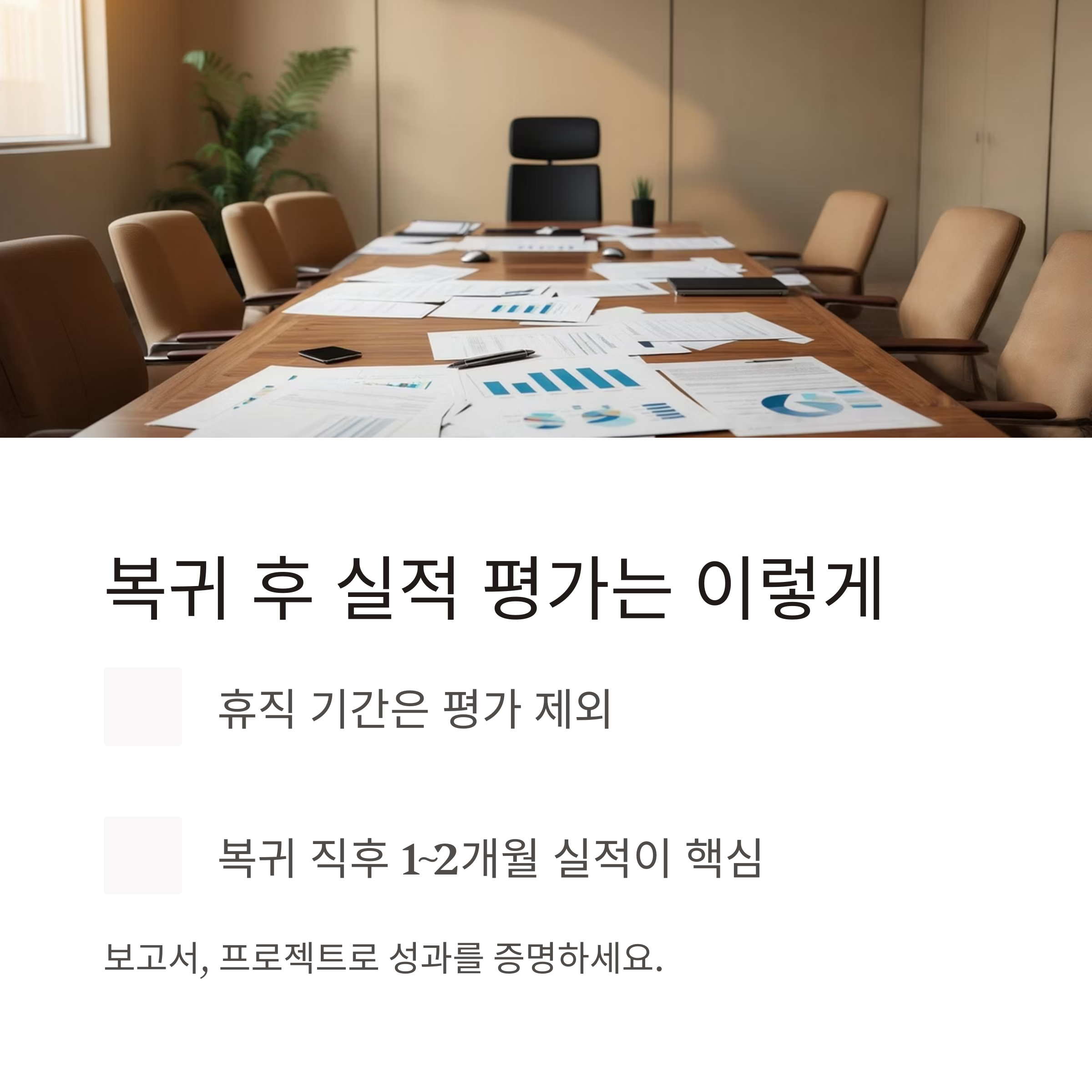 - 복귀 후 1개월 집중 실적 기록: 보고서, 프로젝트, 업무일지 등 최대한 정리