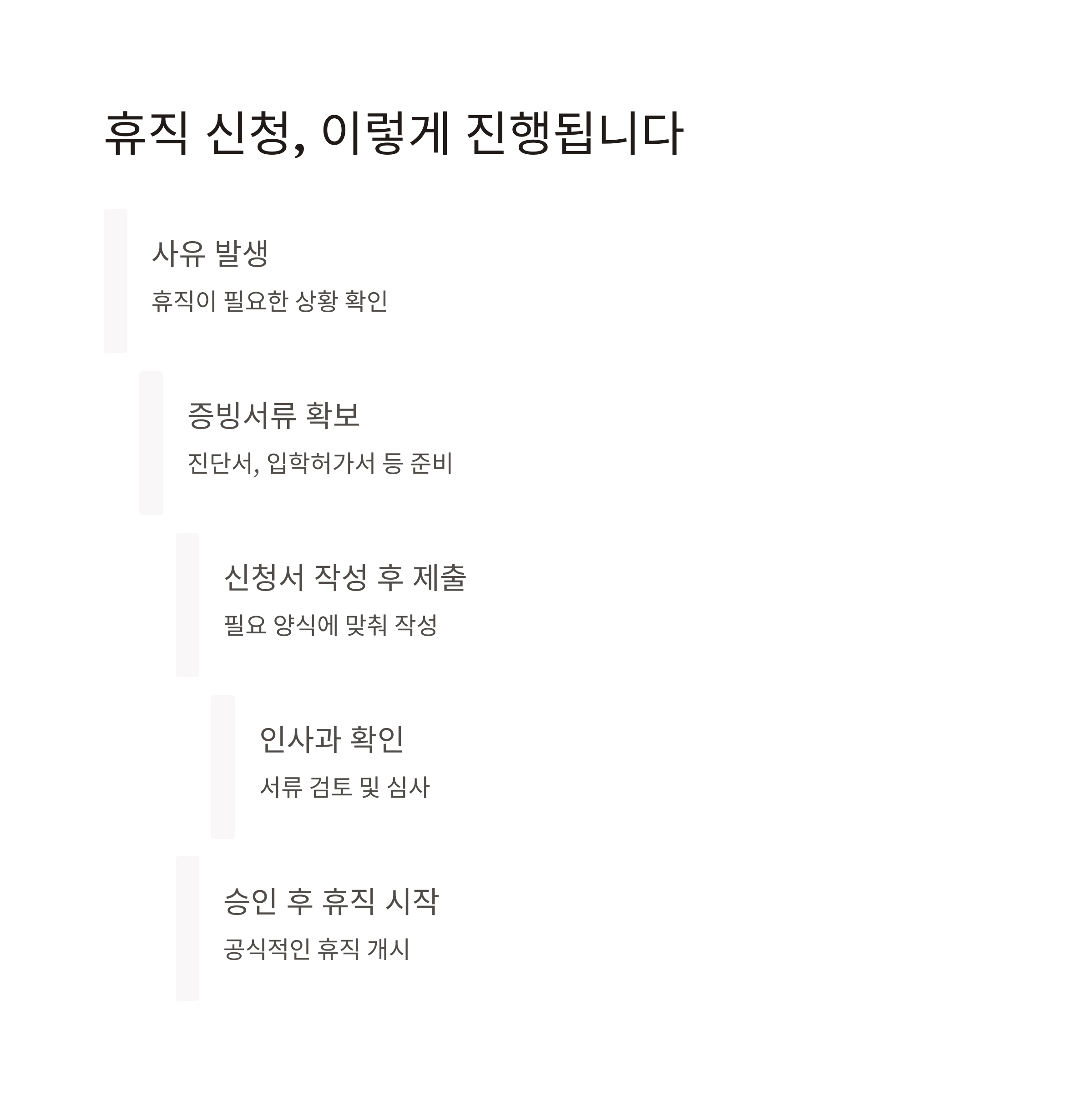 휴직 종류에 따라 차이는 있지만, 공무원 휴직 신청의 기본적인 흐름은 다음과 같습니다.