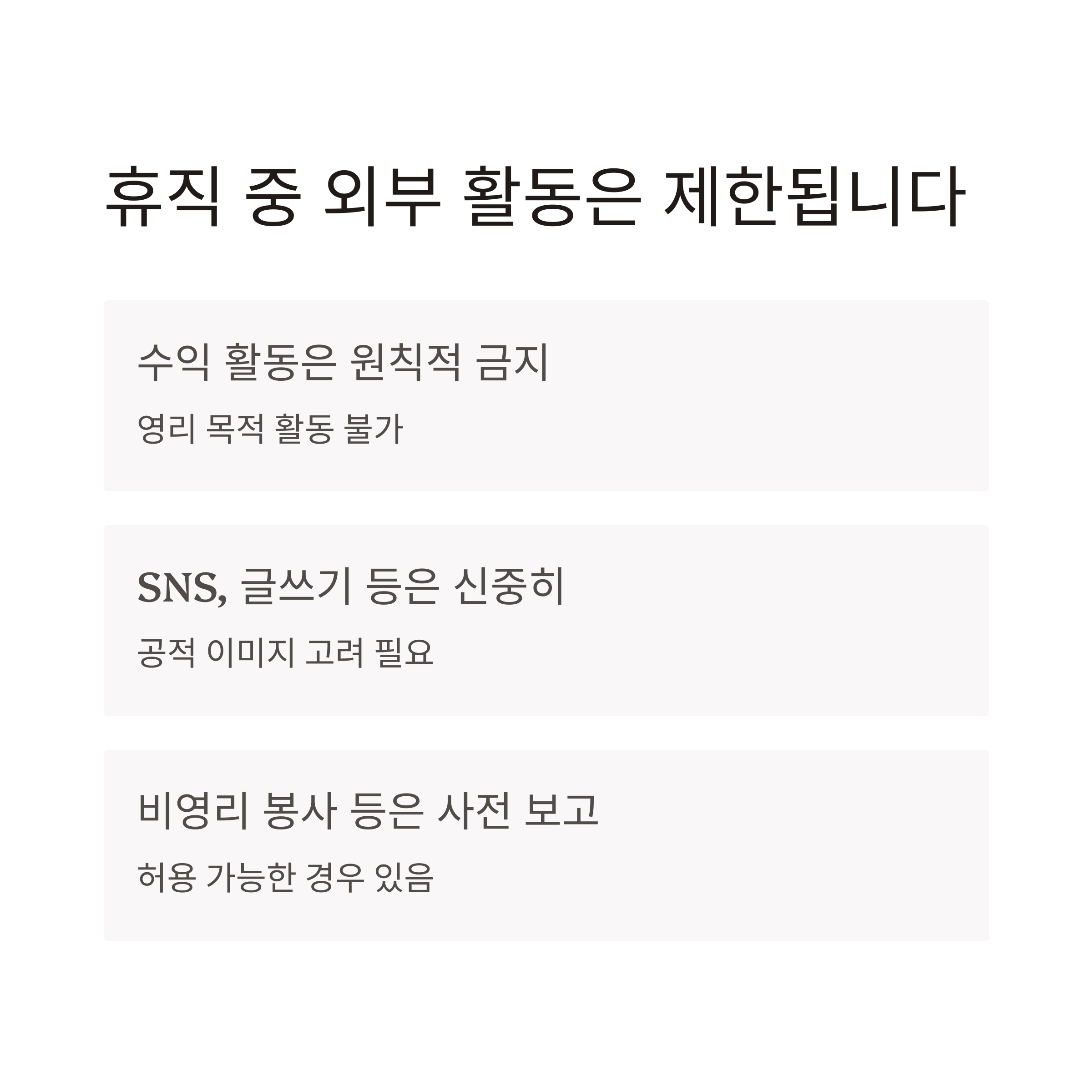 | 유급 강의, 컨설팅 | 사전 승인 필수 | 휴직 사유와 무관한 경우 불가 |