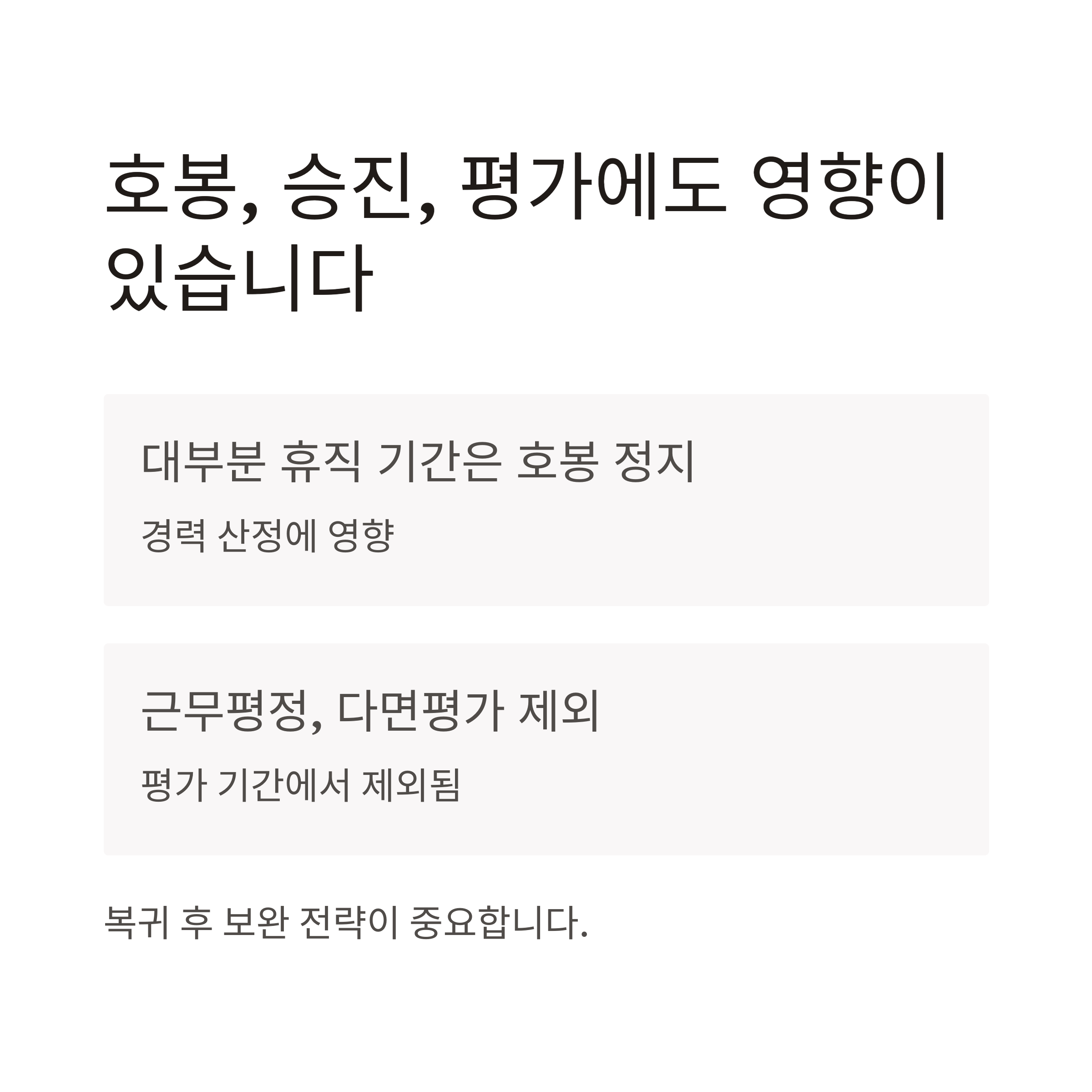 저는 복귀 후 첫 달에 담당했던 과제를 별도 문서로 정리해서 상사에게 제출했고, 그것이 연말 성과평가 때 아주 좋은 인상을 주었다고 하더라고요. 복귀 후 첫 2개월이 평가 인상을 좌우한다고 해도 과언이 아닙니다.