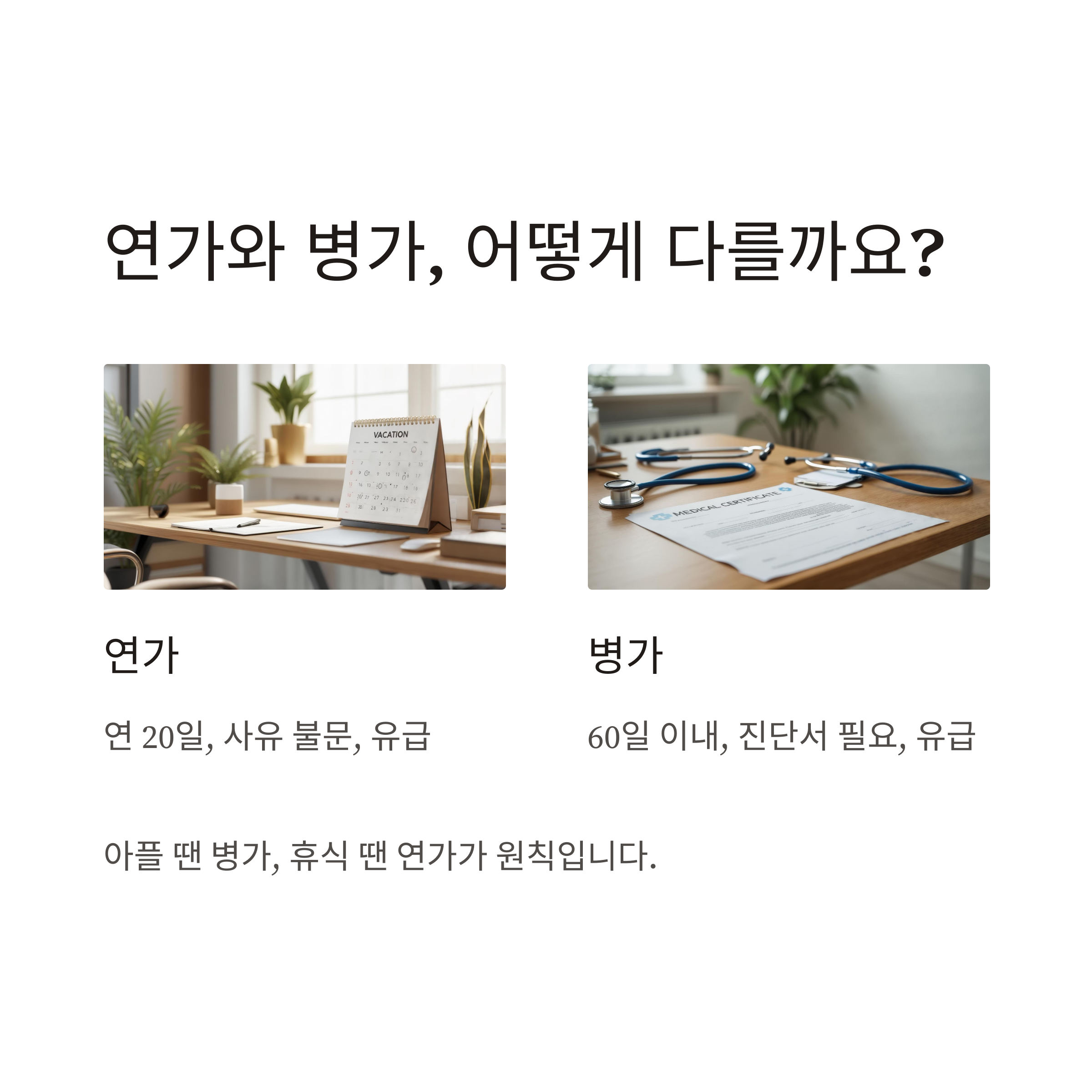 제가 처음 병가를 써본 건 입사 3년 차 때 독감에 걸렸을 때였습니다. 그때야 연가와 병가의 차이를 제대로 알게 됐는데요, 생각보다 많은 분들이 두 제도를 헷갈려 하시더라고요.