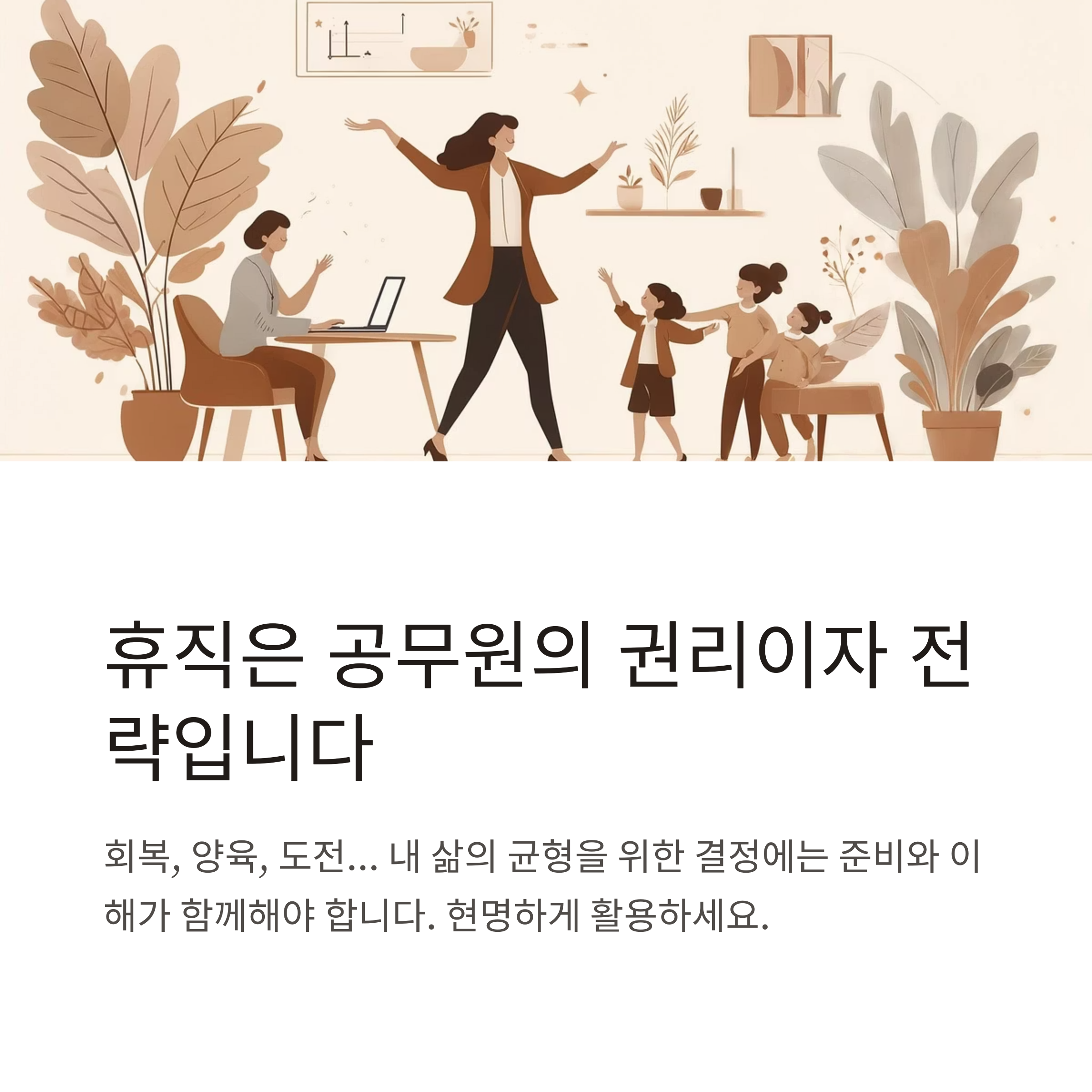 이처럼 공무원 휴직은 단순히 쉬는 것을 넘어서, 경력 단절을 방지하고, 개인의 건강과 가족을 돌볼 수 있는 합법적 시간입니다. 실제로 현장에서는 유급과 무급의 차이, 신청 시기, 담당자 성향까지도 매우 중요하다는 걸 느꼈습니다.