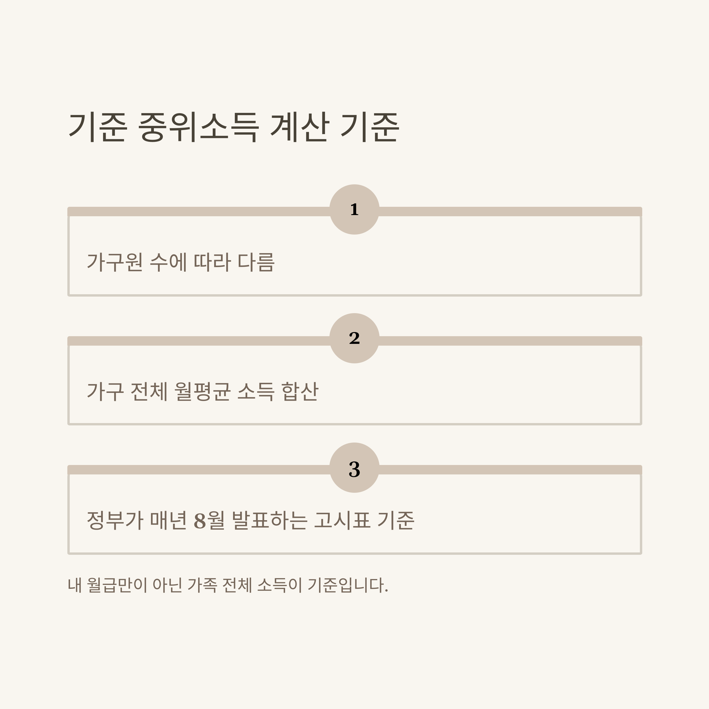 - 예: 3인가구, 월 소득 합산 300만 원, 해당 연도 3인가구 기준 중위소득 500만 원이면 300/500 × 100 = 60%