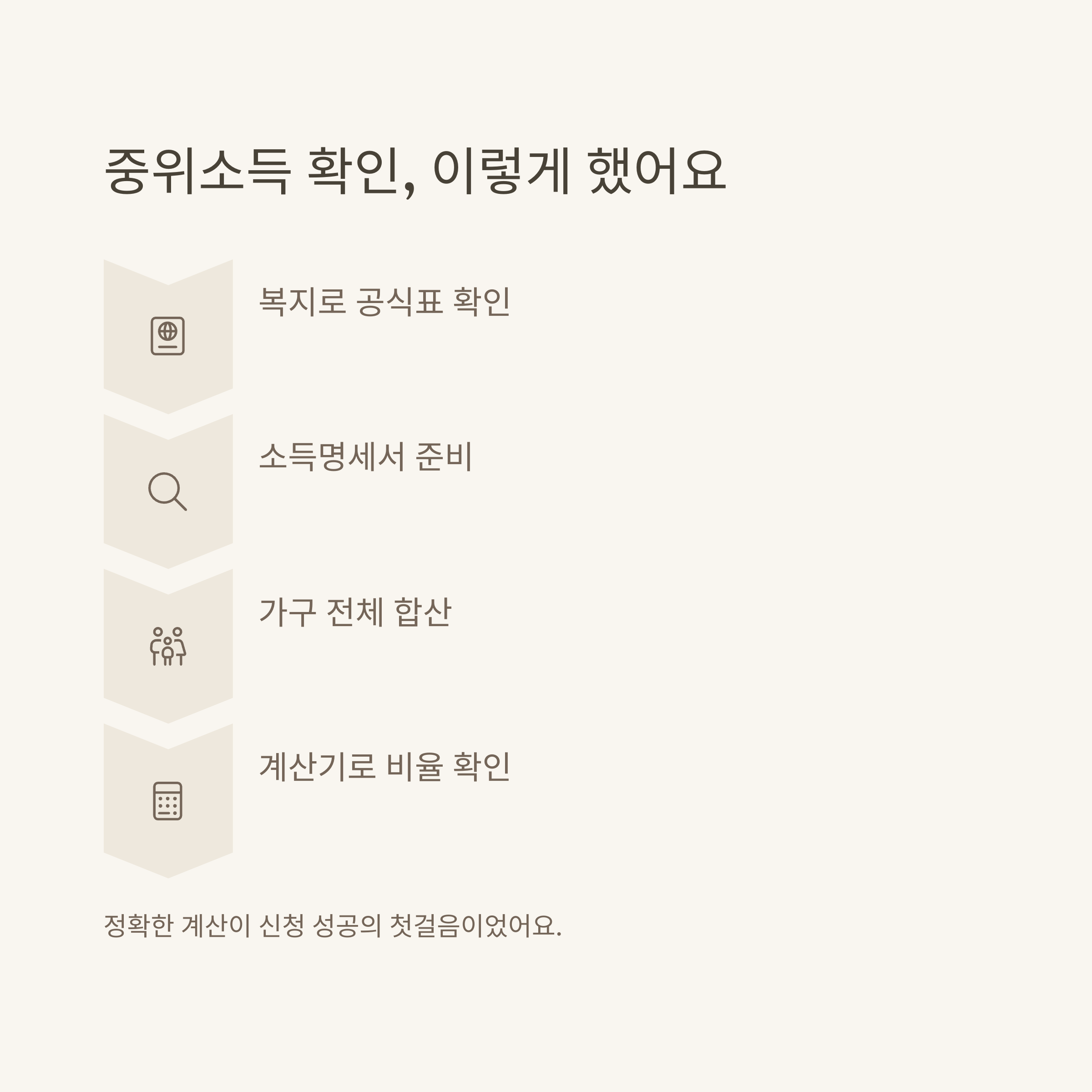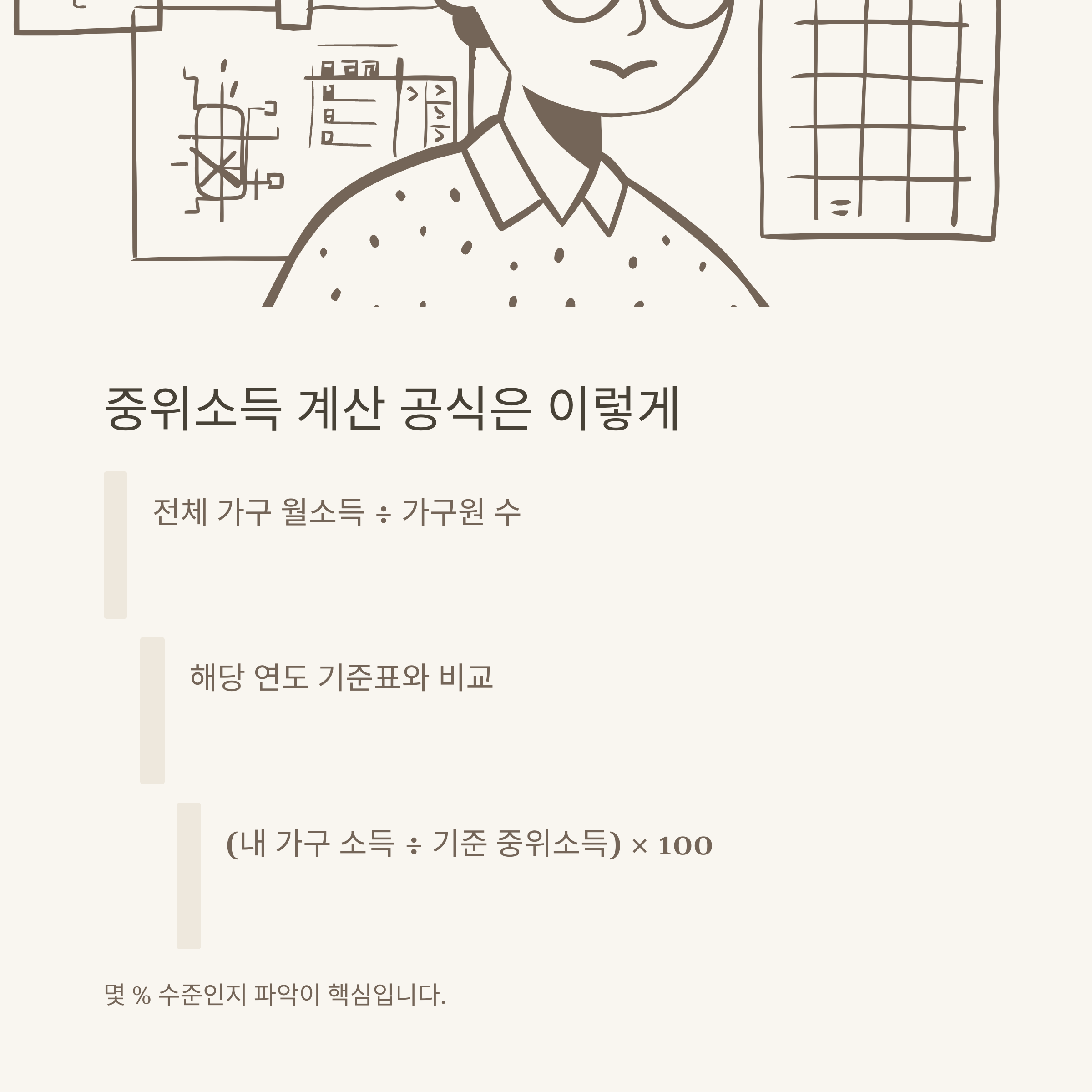 중위소득 계산은 “가구원 수”, “연도별 정부 공시표”가 핵심입니다. 저도 처음에는 그냥 내 월급만 보면 되는 줄 알았지만, 실제로는 가족 모두의 소득(세전·세후), 가구 형태까지 꼼꼼히 따져야 하더라고요.