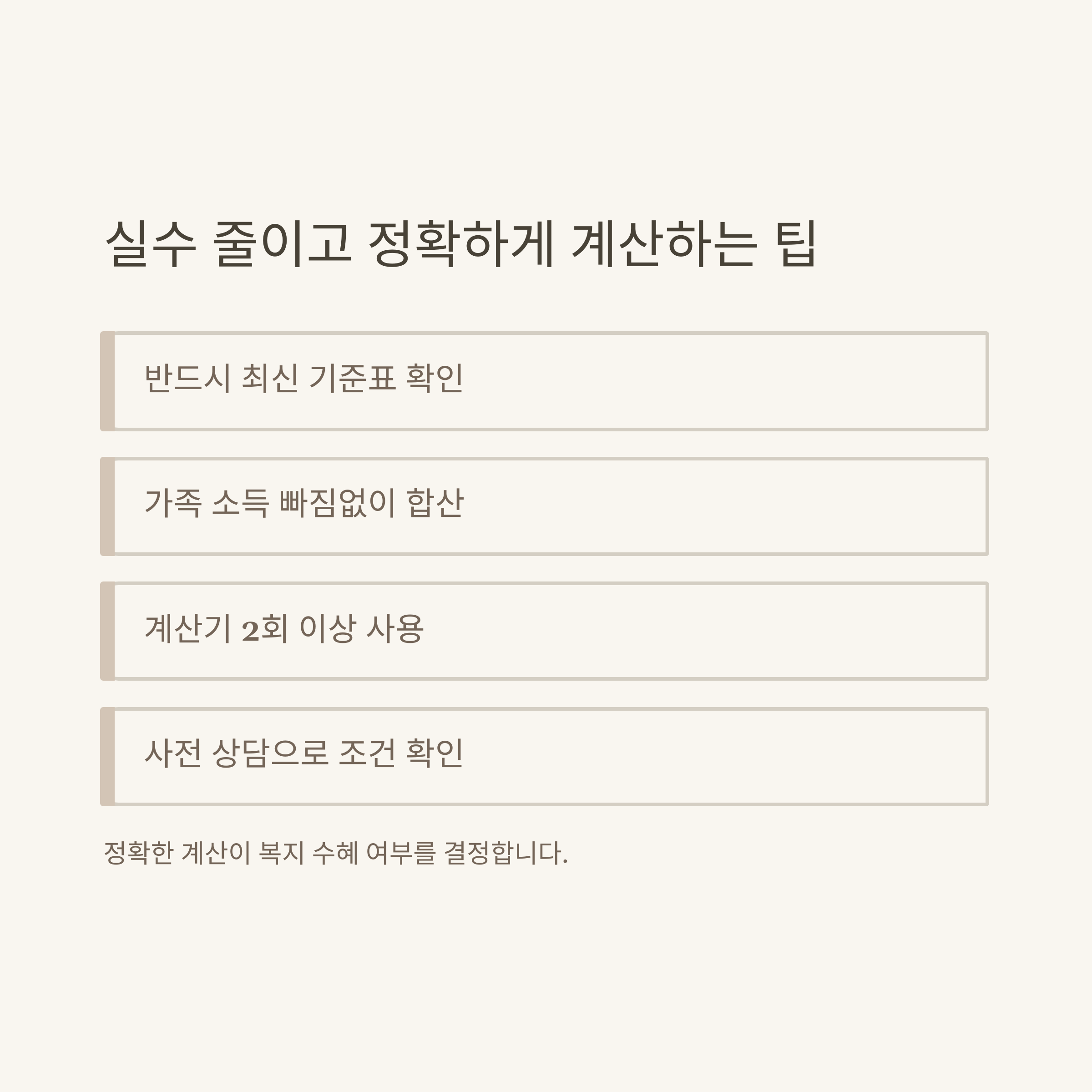 저처럼 수기로 일일이 계산하기 힘들다면, 계산기를 꼭 활용해 보세요. 결과가 빠르고 오류도 없어서 실제 복지 서류 제출 때도 편했습니다.