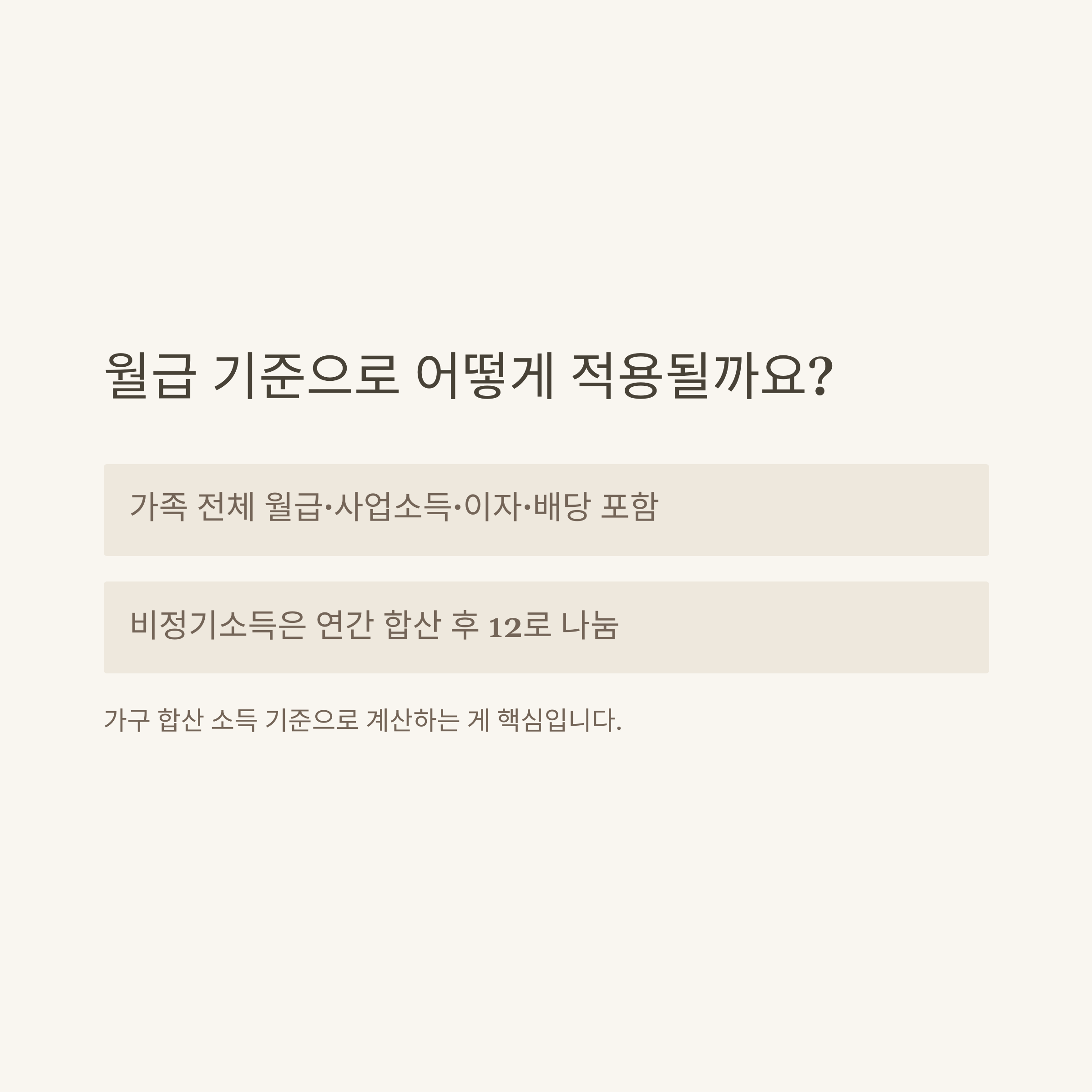 - 가구원 모두의 월급, 사업소득, 임대소득, 이자·배당소득 포함