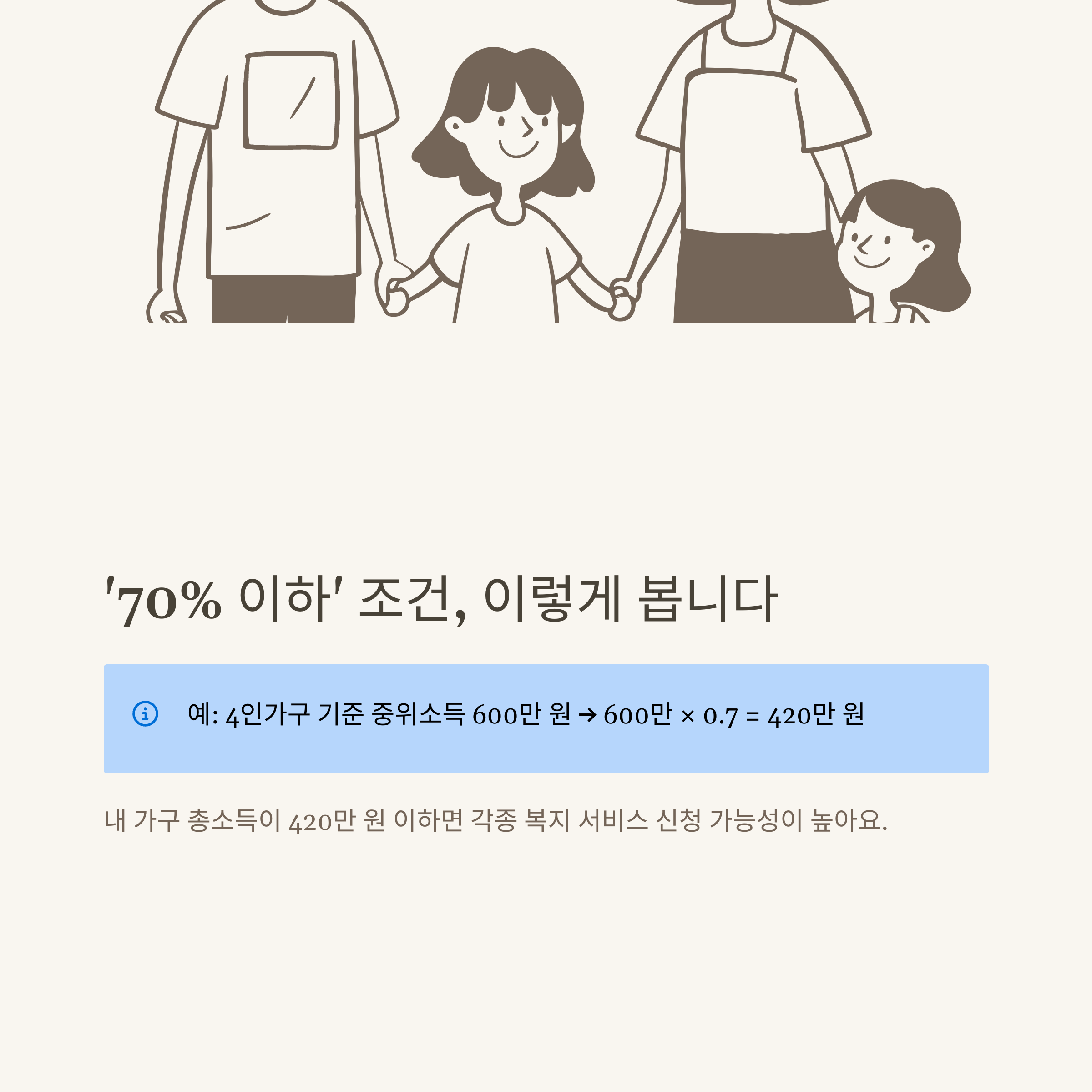 | 70% 계산 | 중위소득 × 0.7 | 복지지원, 바우처 등 | 공식 계산기 활용 | 계산기 |