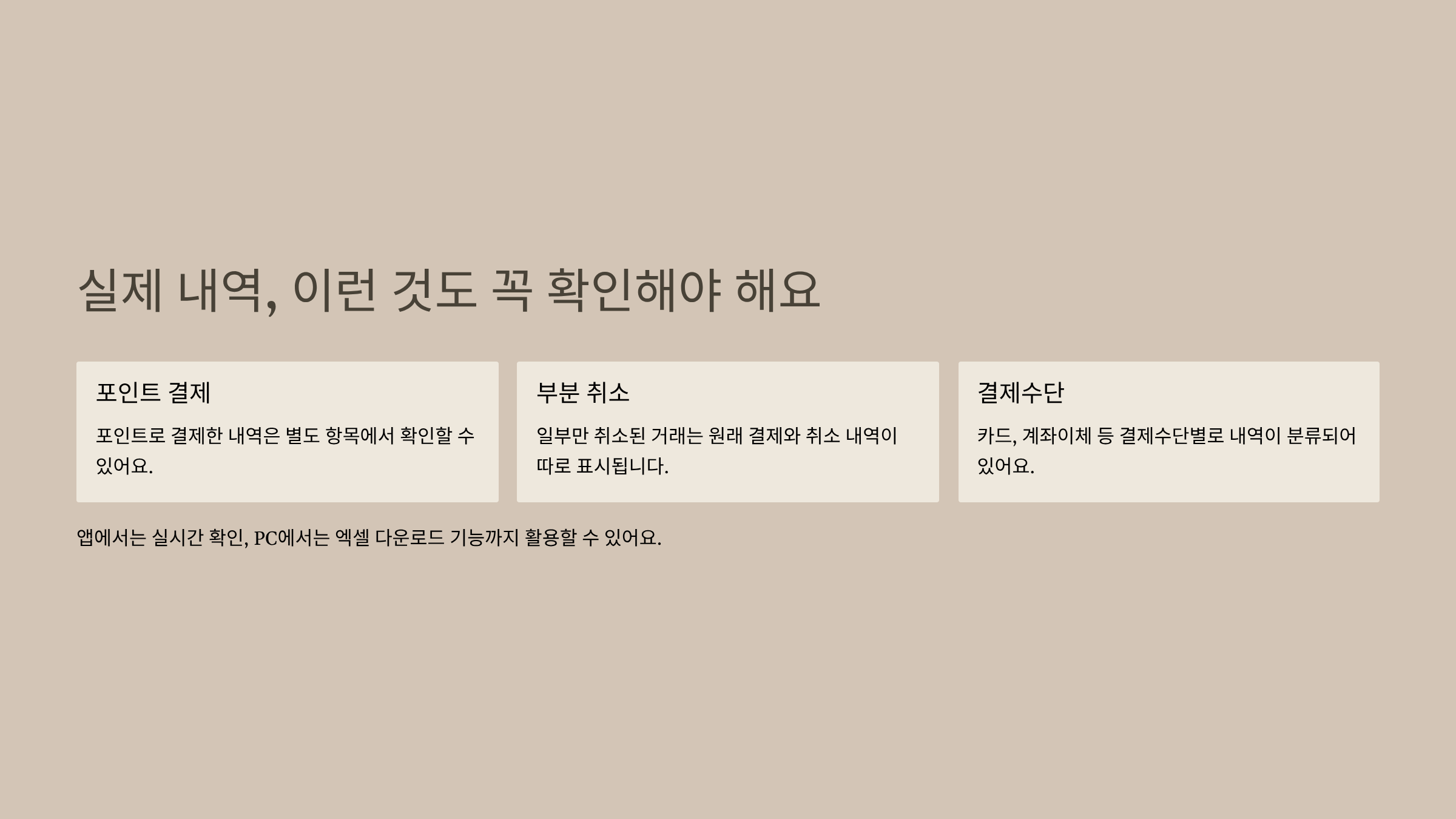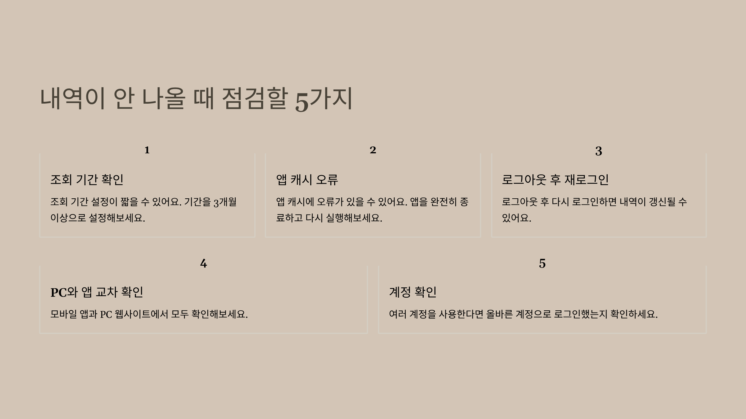 - 거래내역 누락, 이중결제 등 문제 발생 시 필수적으로 확인 필요
