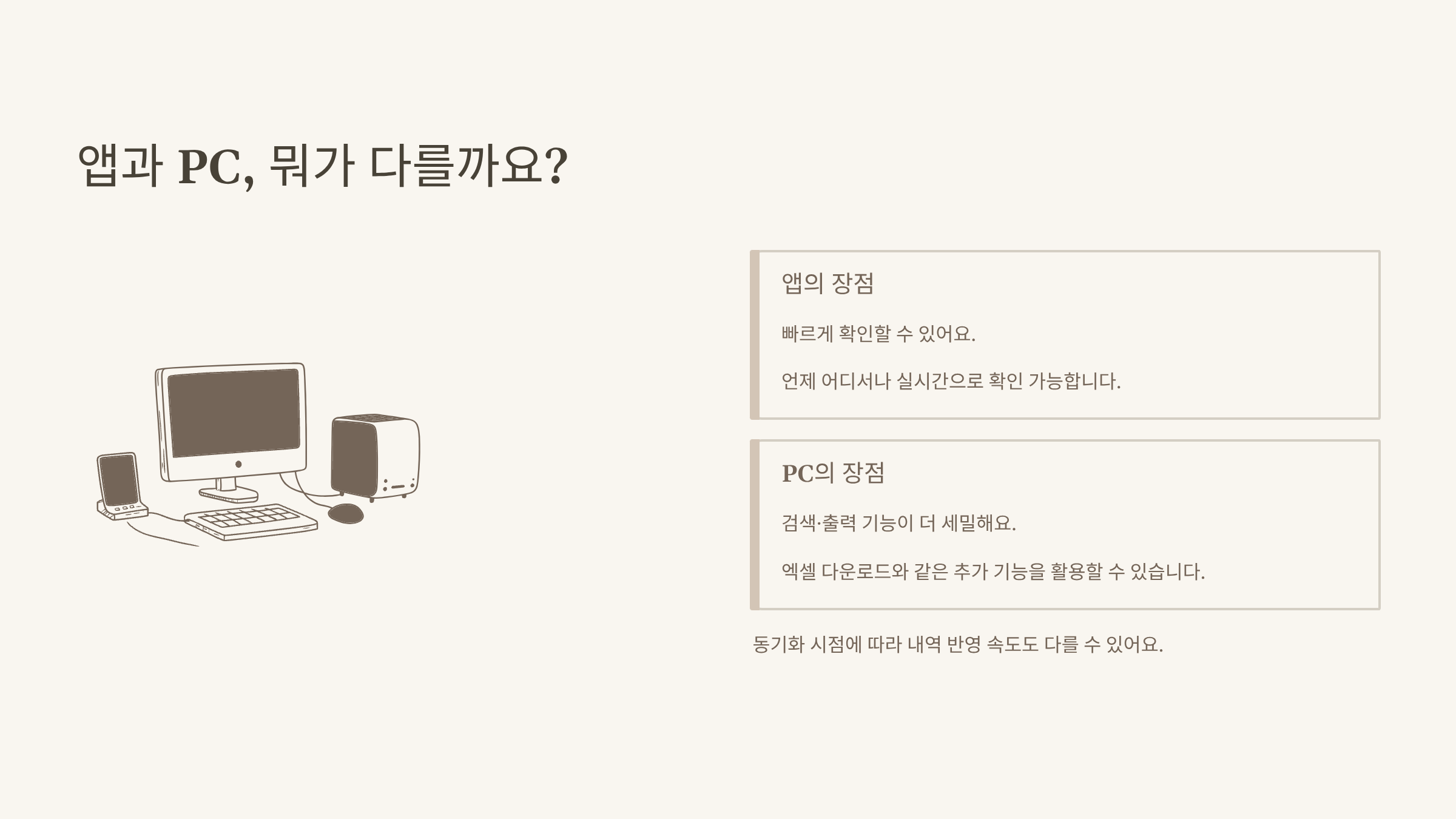 - 앱: 실시간 내역 확인, 즉시 알림, 간편한 UI