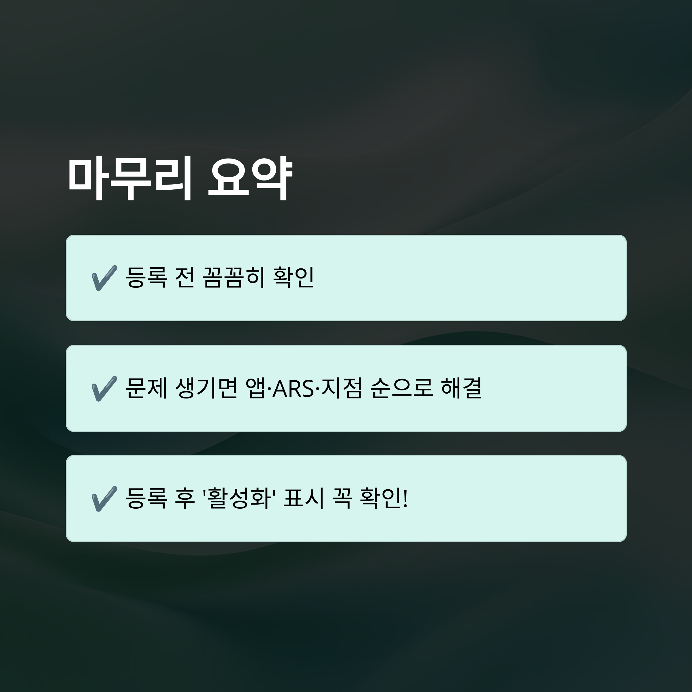 제 경우 앱만 믿다가 안 돼서 결국 ARS로 등록했는데, 안내 멘트를 따라가니 쉽게 활성화됐어요. 앱 외 다른 방법도 준비해 두면 좋습니다.