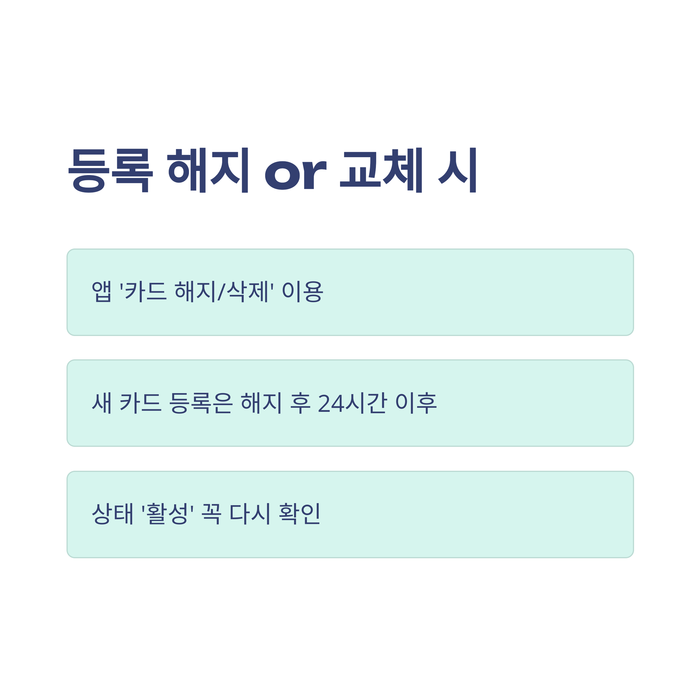 - 앱 내 ‘카드 해지/삭제’ 메뉴로 기존 등록 해제