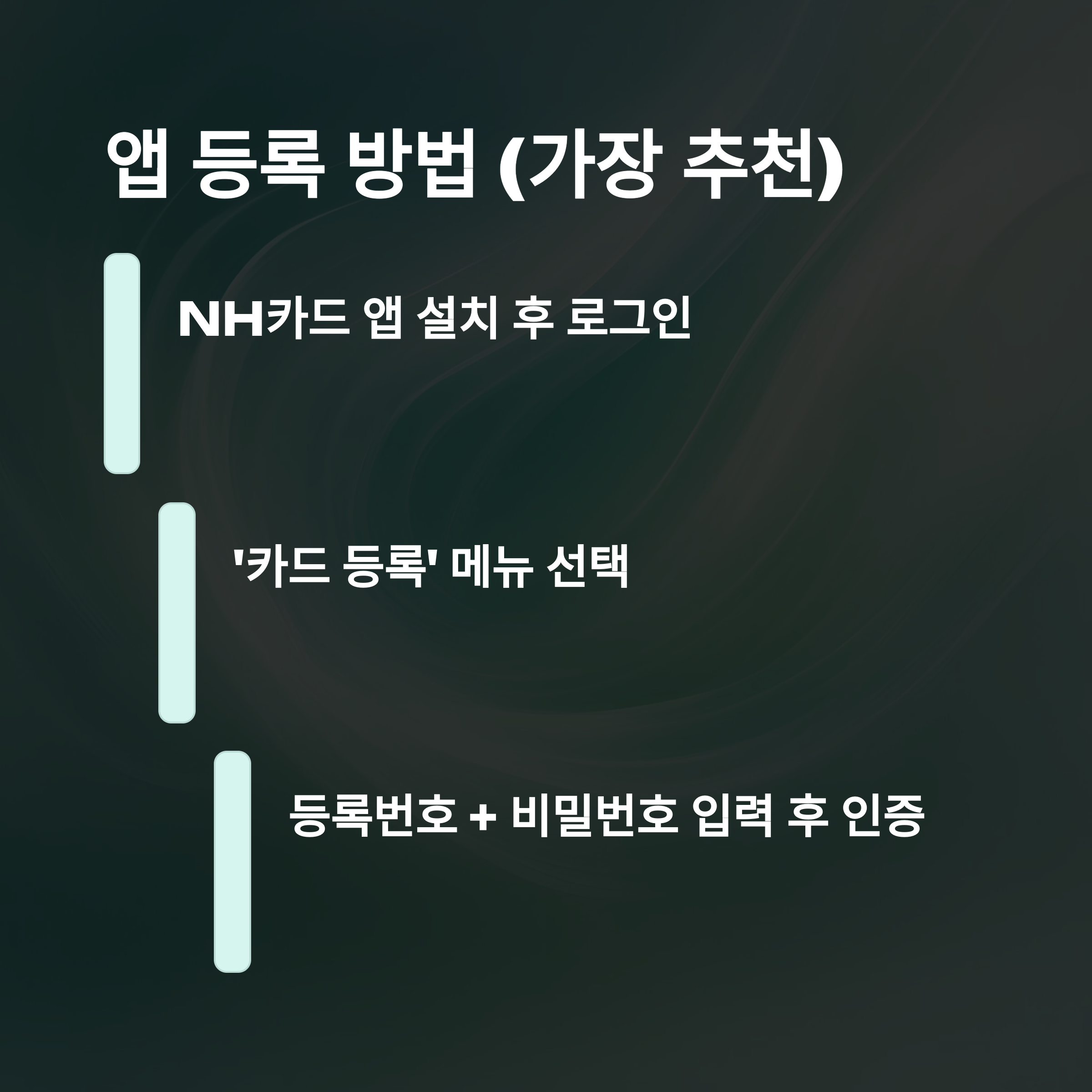 앱 등록이 가장 쉽고 빠릅니다. 저는 NH카드 앱을 사용했는데, 아래 과정을 따라가면 2분 안에 등록 끝납니다.