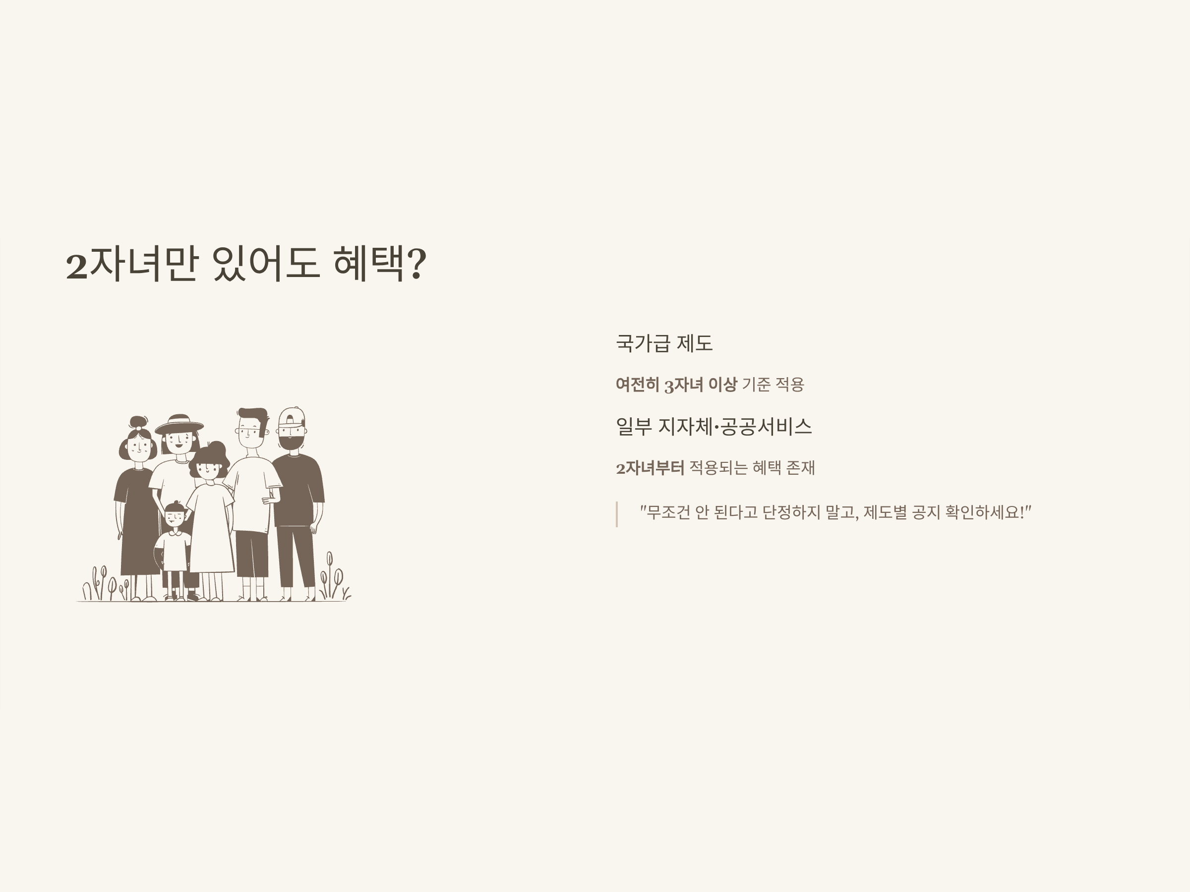 둘째 아이를 낳고 나서 가장 궁금했던 부분이 바로 이거였어요. “두 자녀만 있어도 다자녀 혜택을 받을 수 있나요?” 정답은 “제도에 따라 다르다”입니다. 대표적으로 자동차 다자녀 번호판, 일부 지자체 공공요금 할인, 출산지원금 같은 경우는 2자녀부터 다자녀로 인정됩니다. 하지만 국토부의 청약 특공, 한국장학재단의 국가장학금 등은 여전히 3자녀 이상이 기준이에요. 저는 처음에 지역 도서관 연간이용권 할인 대상이 다자녀라길래 안 될 줄 알았는데, 확인해보니 2자녀부터 가능하더라고요. 이처럼 각 제도의 적용 대상이 조금씩 다르기 때문에 무조건 안 된다고 단정 짓지 말고 꼭 확인해보시는 걸 추천드려요. 해당 정보는 복지로 사이트에서도 제도별로 자세히 안내되어 있습니다.