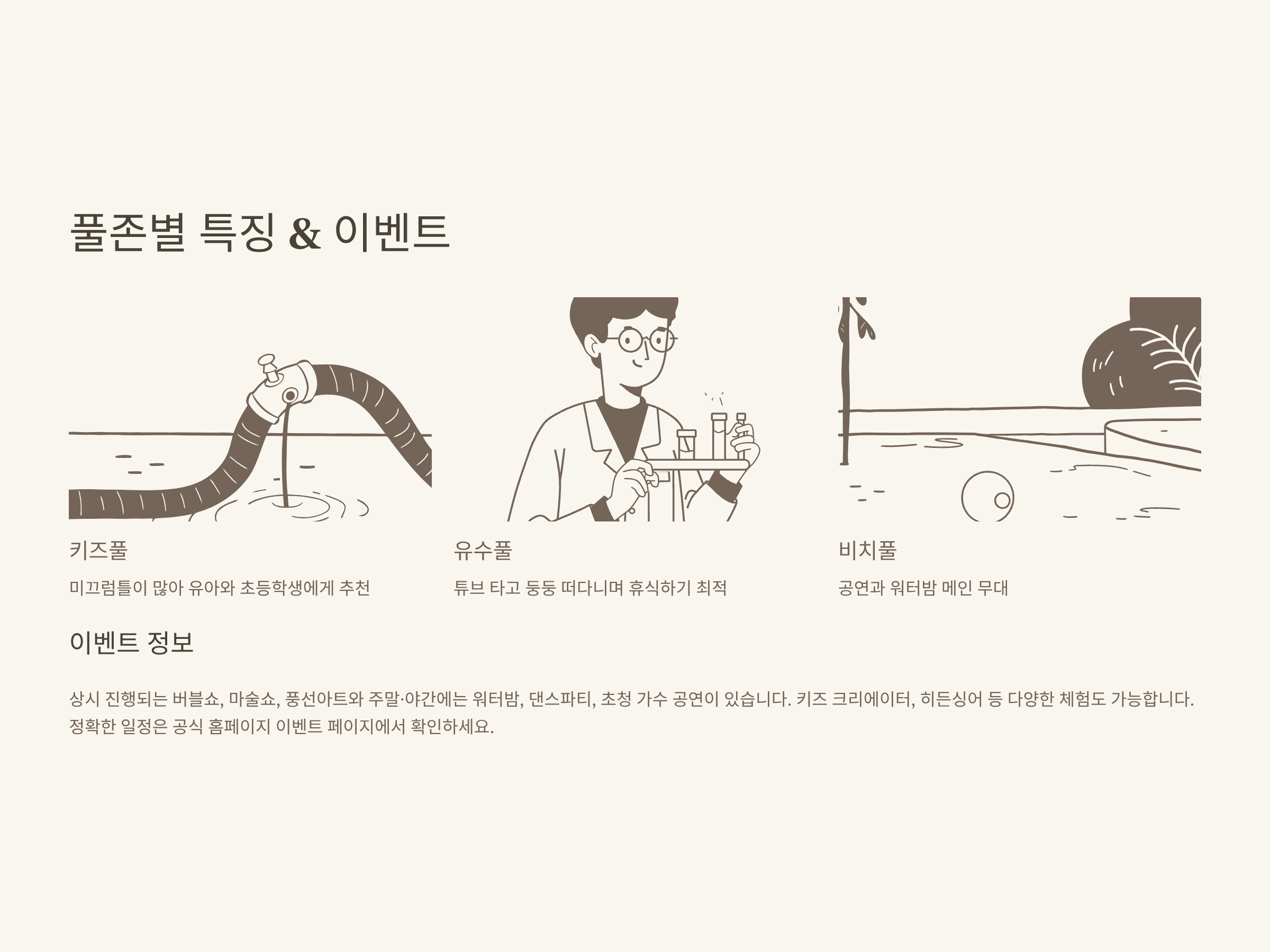 유수풀, 비치풀, 인피니티풀, 물썰매장 모두 저마다 재미와 매력이 달라서, 실제로 저희 가족은 하루 종일 쉬는 시간 없이 뛰어다녔습니다. 공식 홈페이지 아마존 워터파크 풀 안내에 지도와 사진이 잘 나와있으니 동선 파악하실 때 꼭 참고해보세요.
