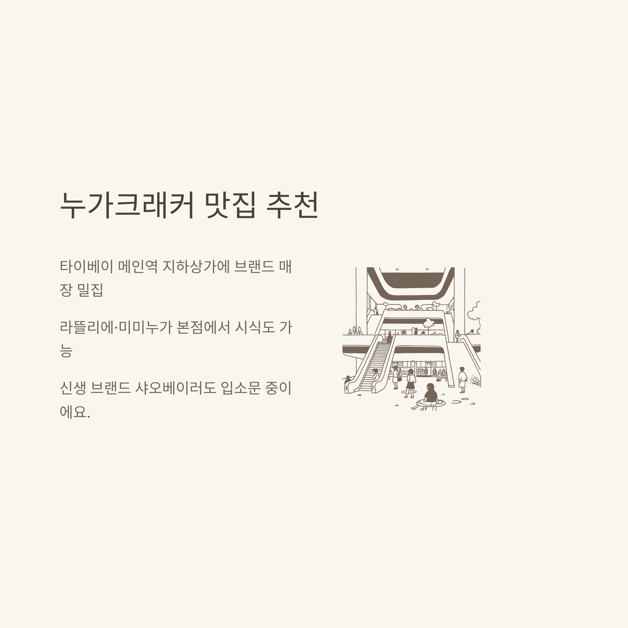 실제로 대만 여행을 준비하면서, 현지인과 자주 연락하는 친구에게 “누가크래커 어디서 사야 제일 맛있어?” 하고 물어본 적이 있습니다. 가장 많이 추천받은 곳이 바로 라뜰리에 본점(타이베이)과 미미누가 매장이었어요. 타이베이 메인역 지하상가에는 여러 브랜드가 밀집해 있어서, 여기서 시식 후 골라보는 재미도 있었습니다. 저도 현장에서 시식해보니 라뜰리에의 오리지널과 미미누가의 아몬드 누가크래커가 확실히 고소하고 깊은 맛이 있더라고요.