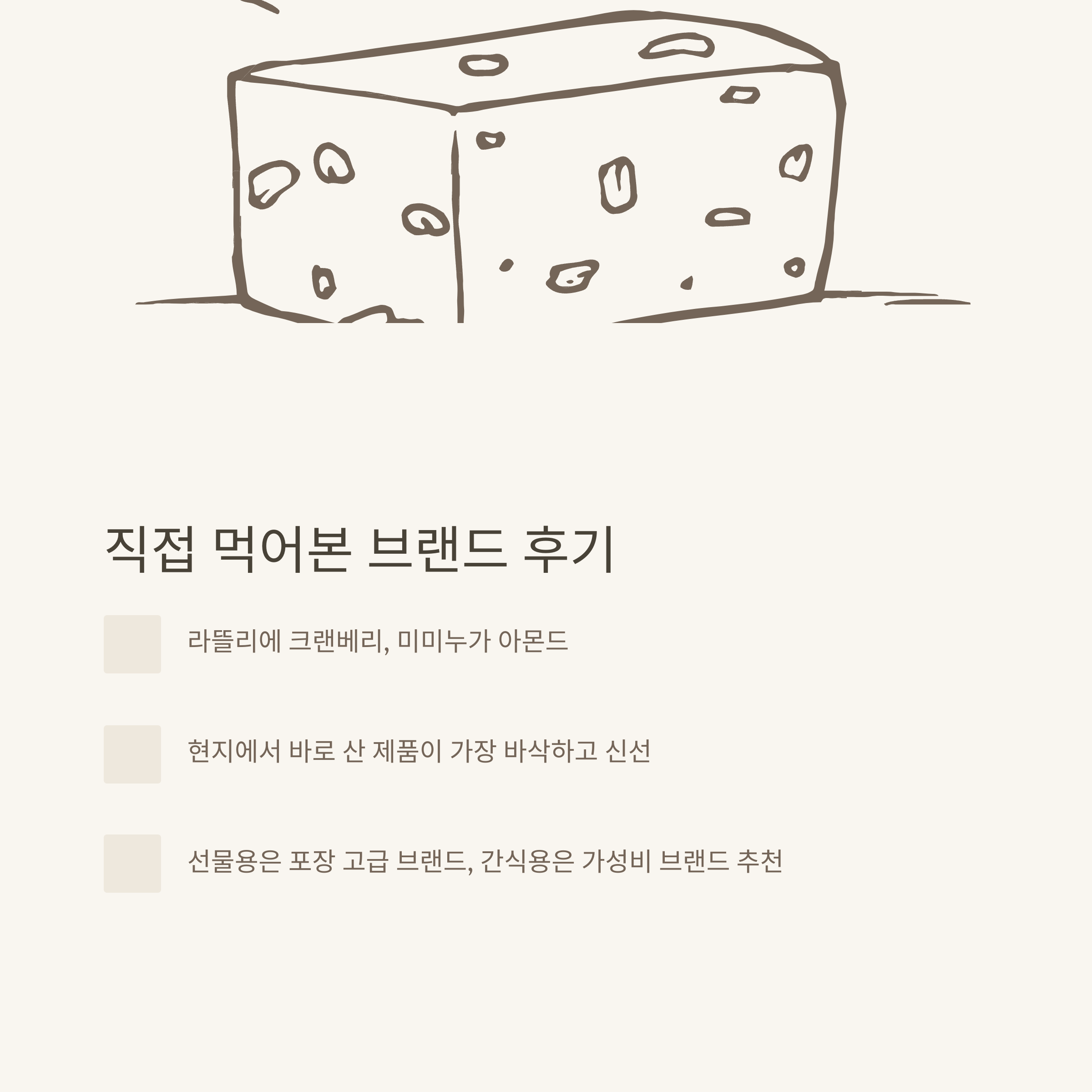 여행 이후로는 주로 온라인으로 직구해서 먹고 있는데, 구매처마다 조금씩 맛 차이가 있더라고요. 특히 현지에서 바로 사온 제품이 확실히 신선하고, 크래커 부분이 더 바삭하게 느껴졌습니다. 선물용으로 고민하시는 분이라면 포장이 고급스러운 브랜드(예: 라뜰리에)를, 간식용이나 가성비를 원하신다면 미미누가나 천천누가도 충분히 만족스러웠습니다.