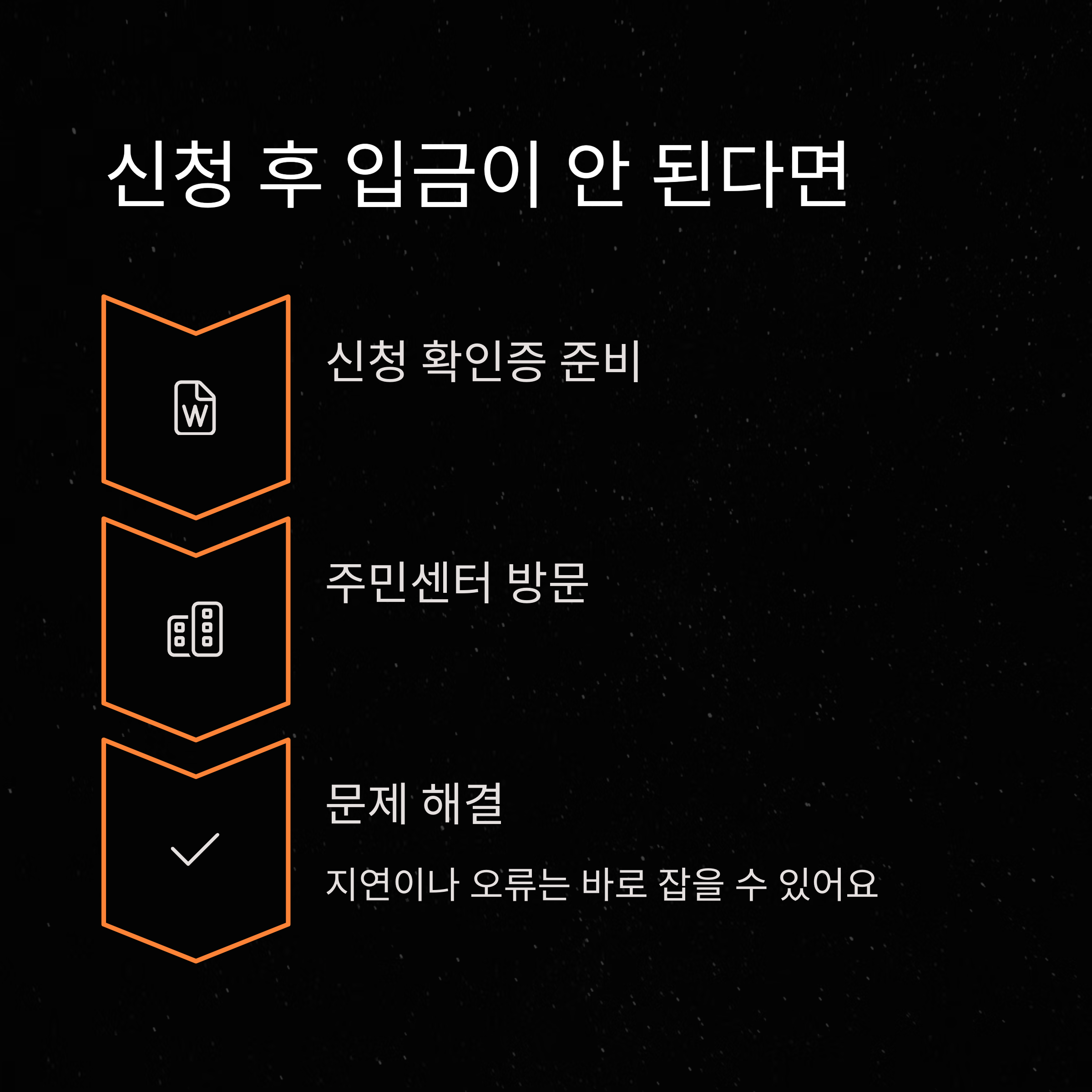 만약 신청 후 일주일이 지나도 입금이 되지 않는다면, 신청 확인증을 가지고 주민센터나 정부24 민원 게시판을 통해 확인 요청이 가능합니다.