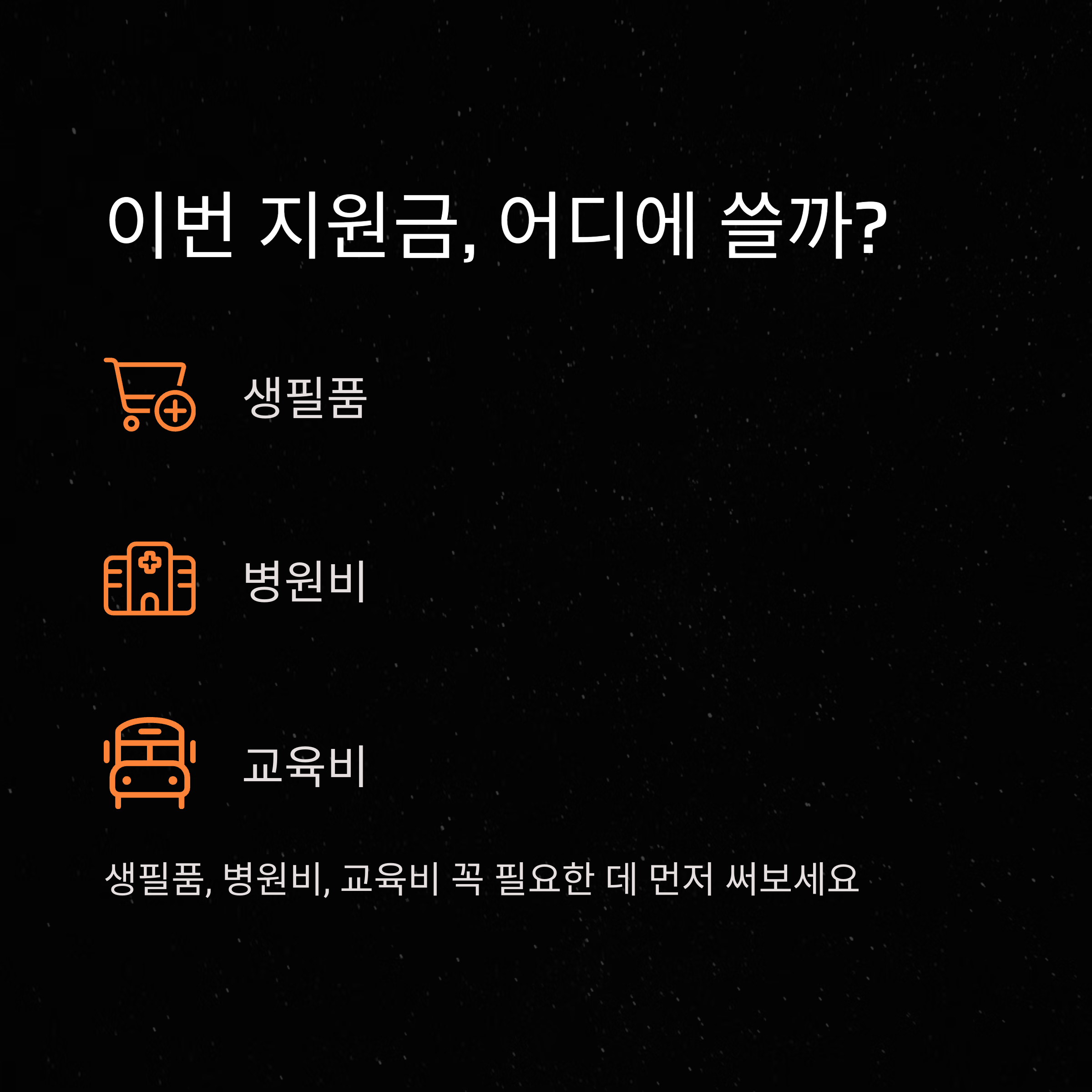 또한 이번 지원금은 단순한 ‘소비’가 아니라 ‘생활 안정’이라는 관점에서 접근하시면 좋습니다. 꼭 필요했던 병원비, 아이들 교육비, 공과금 등에 활용하면 더 큰 만족감을 얻을 수 있어요.