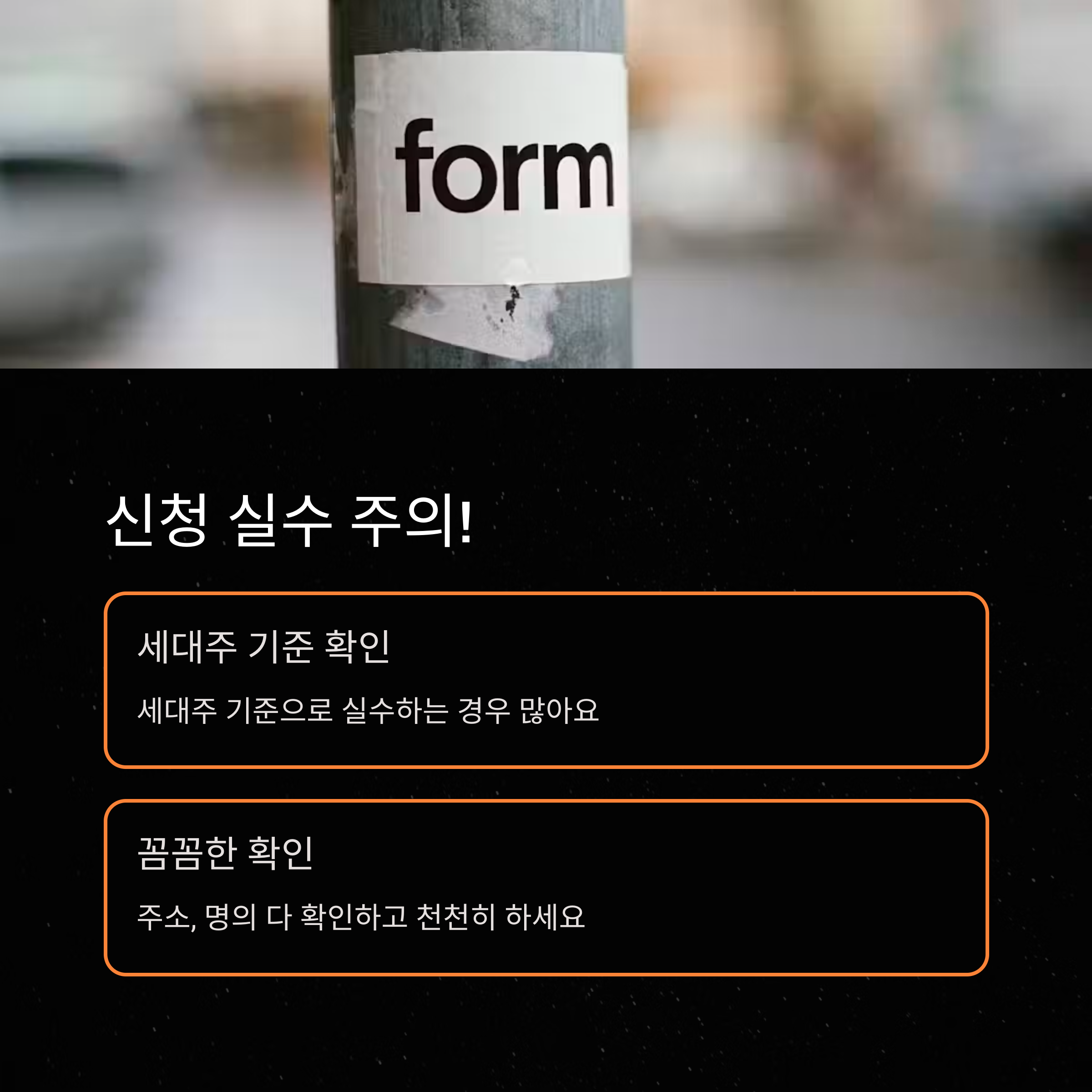 신청 과정에서 놓치기 쉬운 부분이 몇 가지 있습니다. 특히 작년에 제가 한 번 실수했던 부분은 '신청 대상 아님' 메시지를 보고 그냥 포기했는데, 사실은 세대주 기준 소득 때문에 발생한 착오였더라고요. 신청 시 유의할 점: