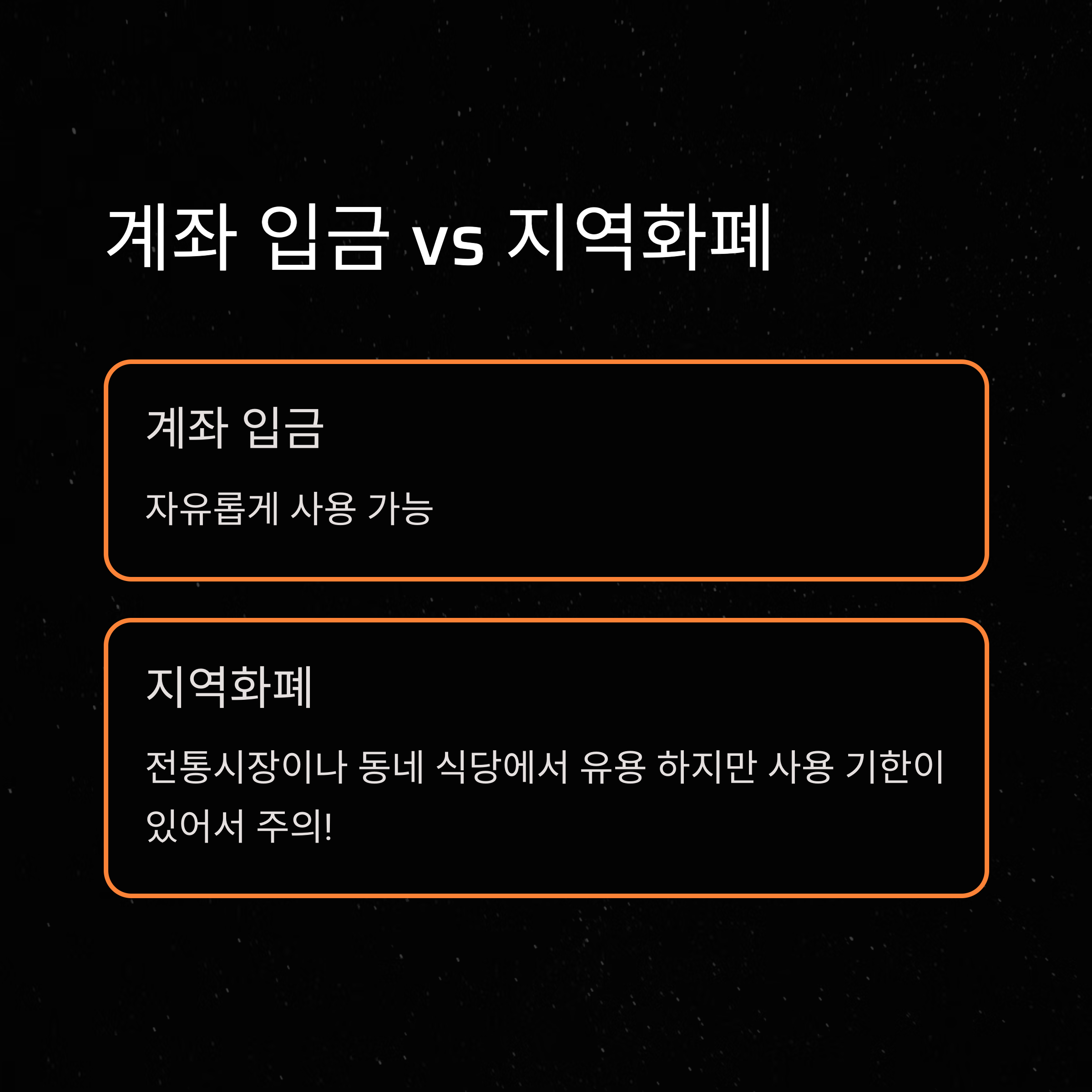 | 구분 | 지역화폐 | 현금 계좌입금 |