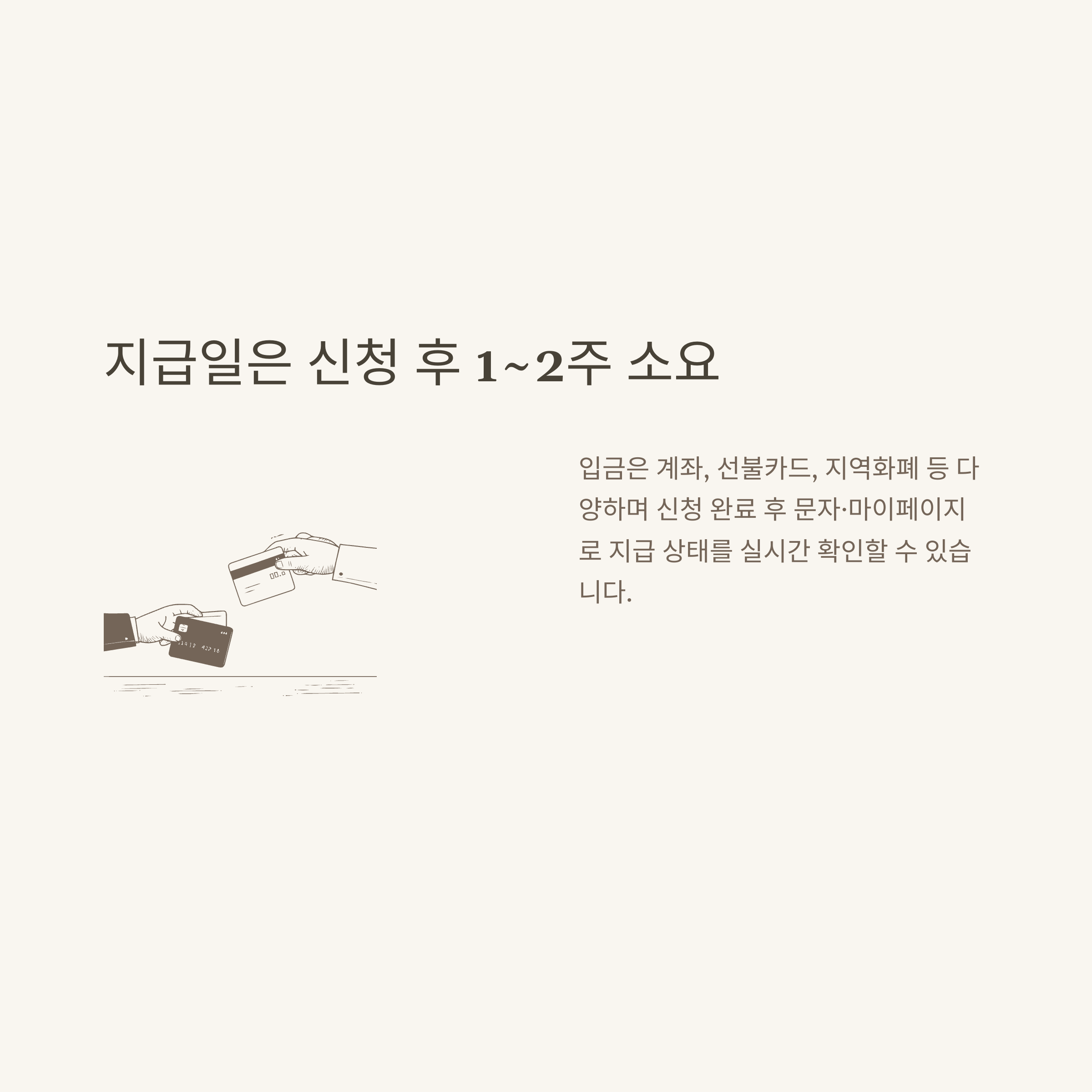 신청 후 7~14일 이내 계좌입금 또는 지역화폐, 선불카드로 지급이 완료되었고, 문자·마이페이지·이메일로 실시간 지급상태를 확인할 수 있었습니다.