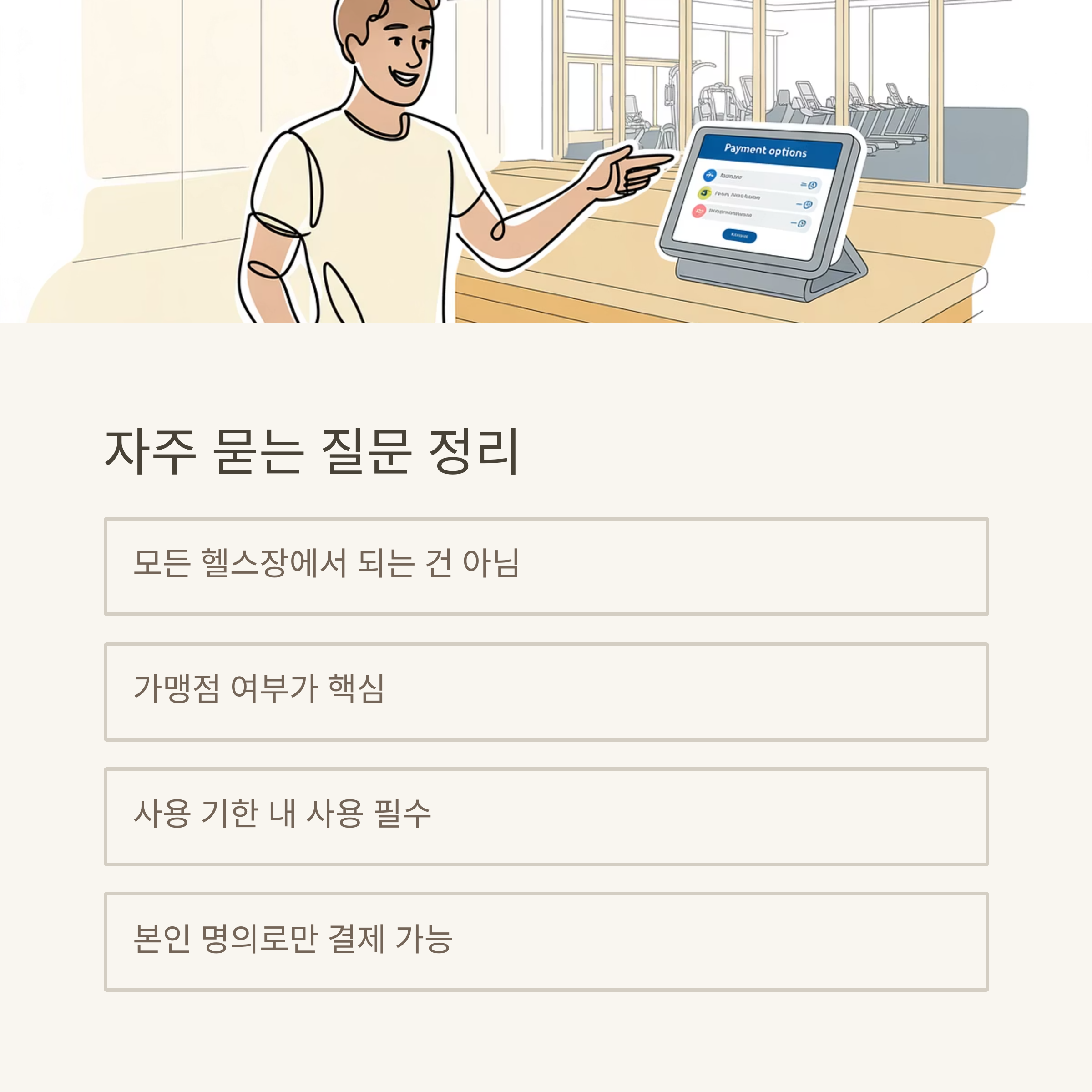 - 선불카드 수령 시: 헬스장이 해당 선불카드 가맹점일 때만 가능. 실물 카드 제시 후 결제.