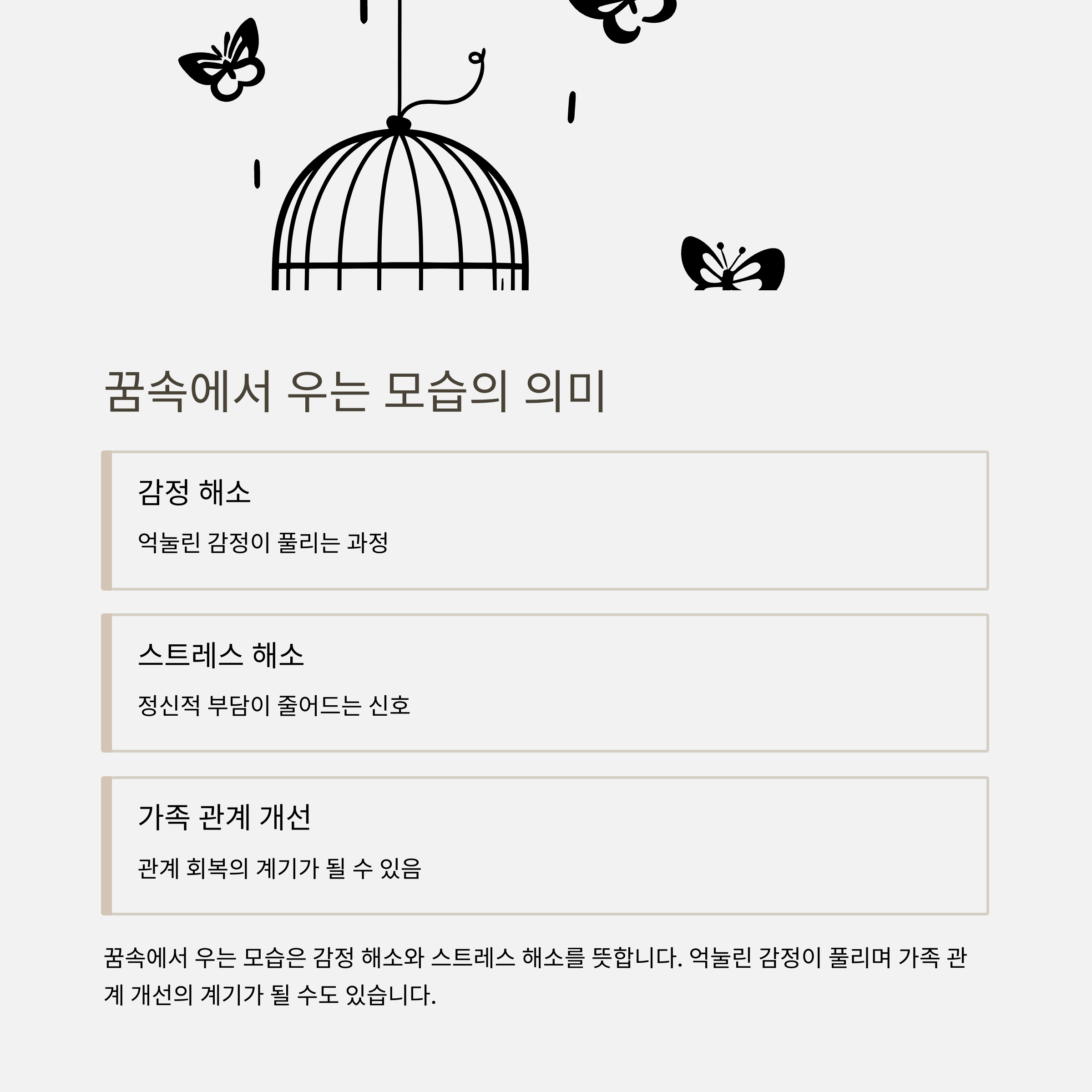 공식 꿈해몽에서는 울음이나 슬픔이 꿈에서 터질수록 현실에서는 오히려 스트레스가 해소되고, 마음에 쌓였던 걱정이 풀릴 수 있다고 해석합니다. 심리학적으로도 억눌려 있던 감정이나, 평소 가족에게 표현하지 못했던 애정·미안함·걱정 등이 꿈을 통해 분출되는 경우가 많다고 해요.